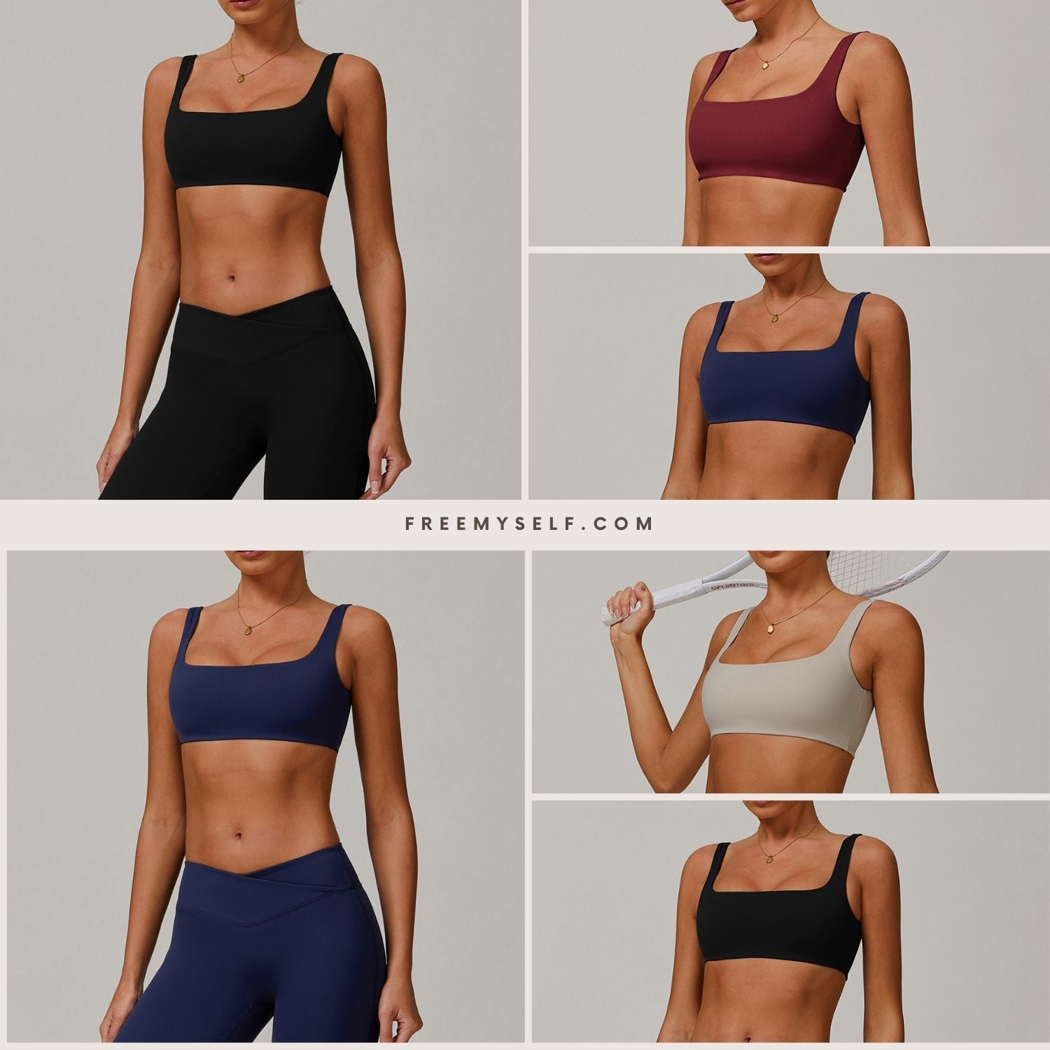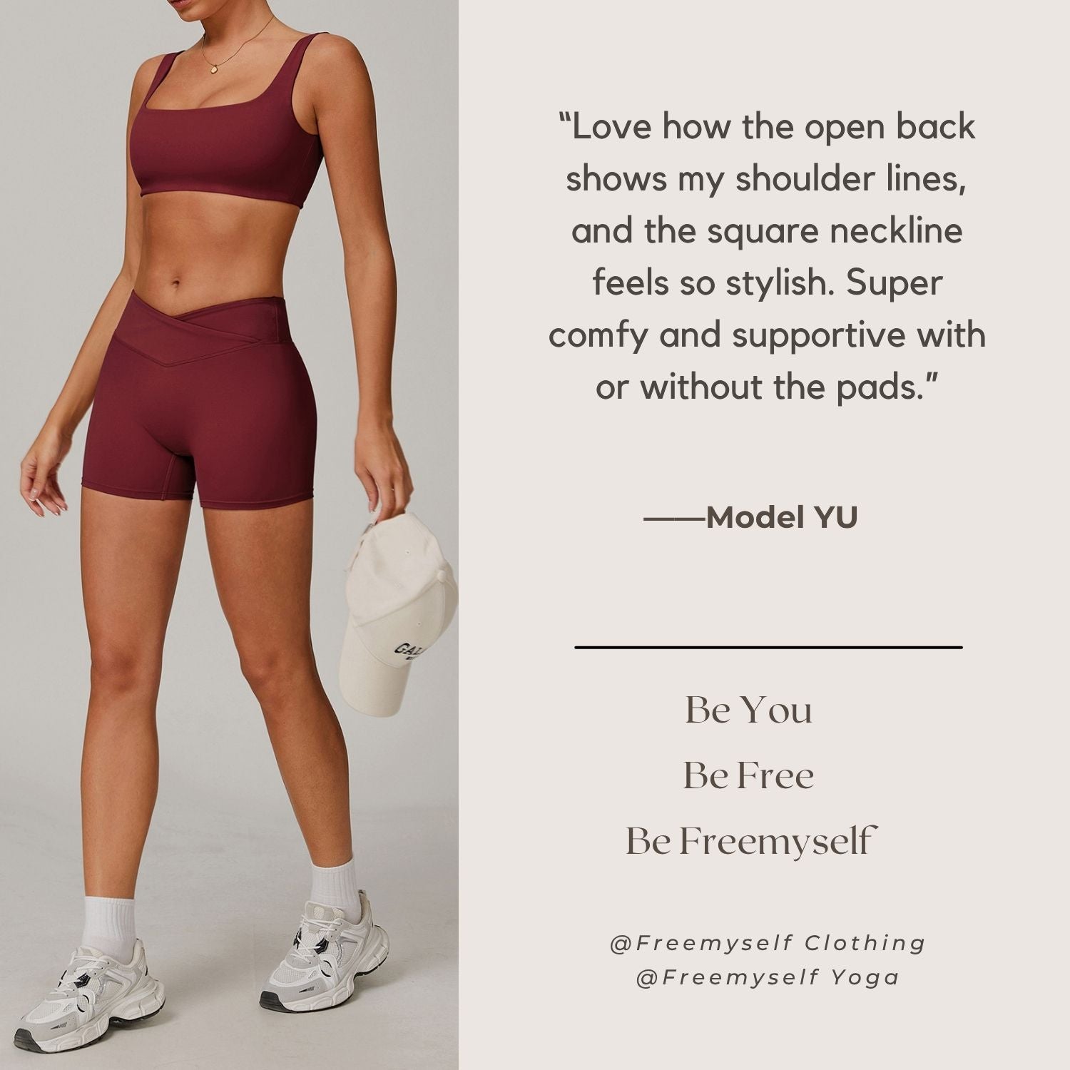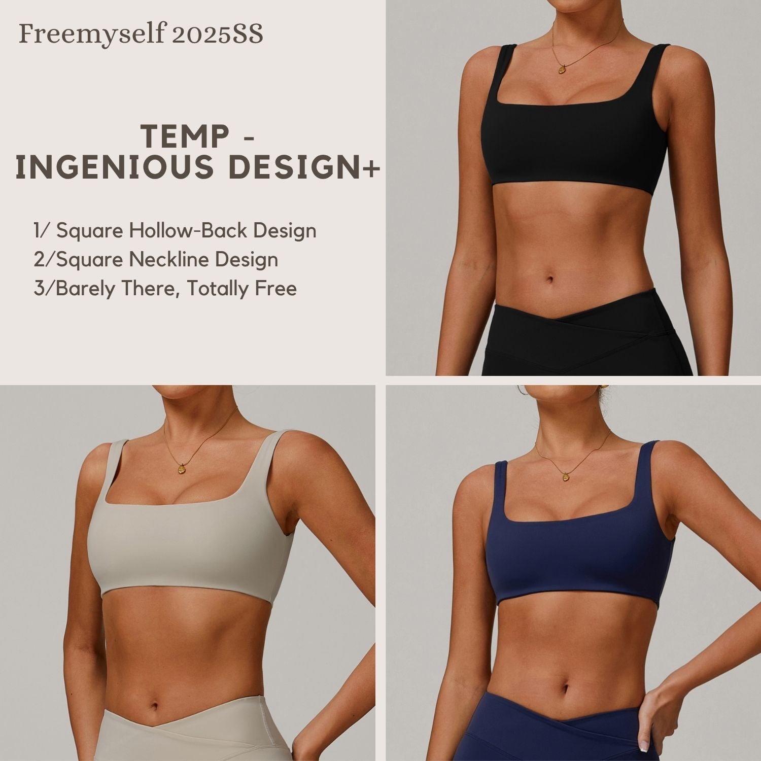 Freemyself 25ss sports bra features a square hollow-back design that shows off the shoulder blades, a square neckline that flatters the neck curve, and removable padding for easy wear from workout to street.