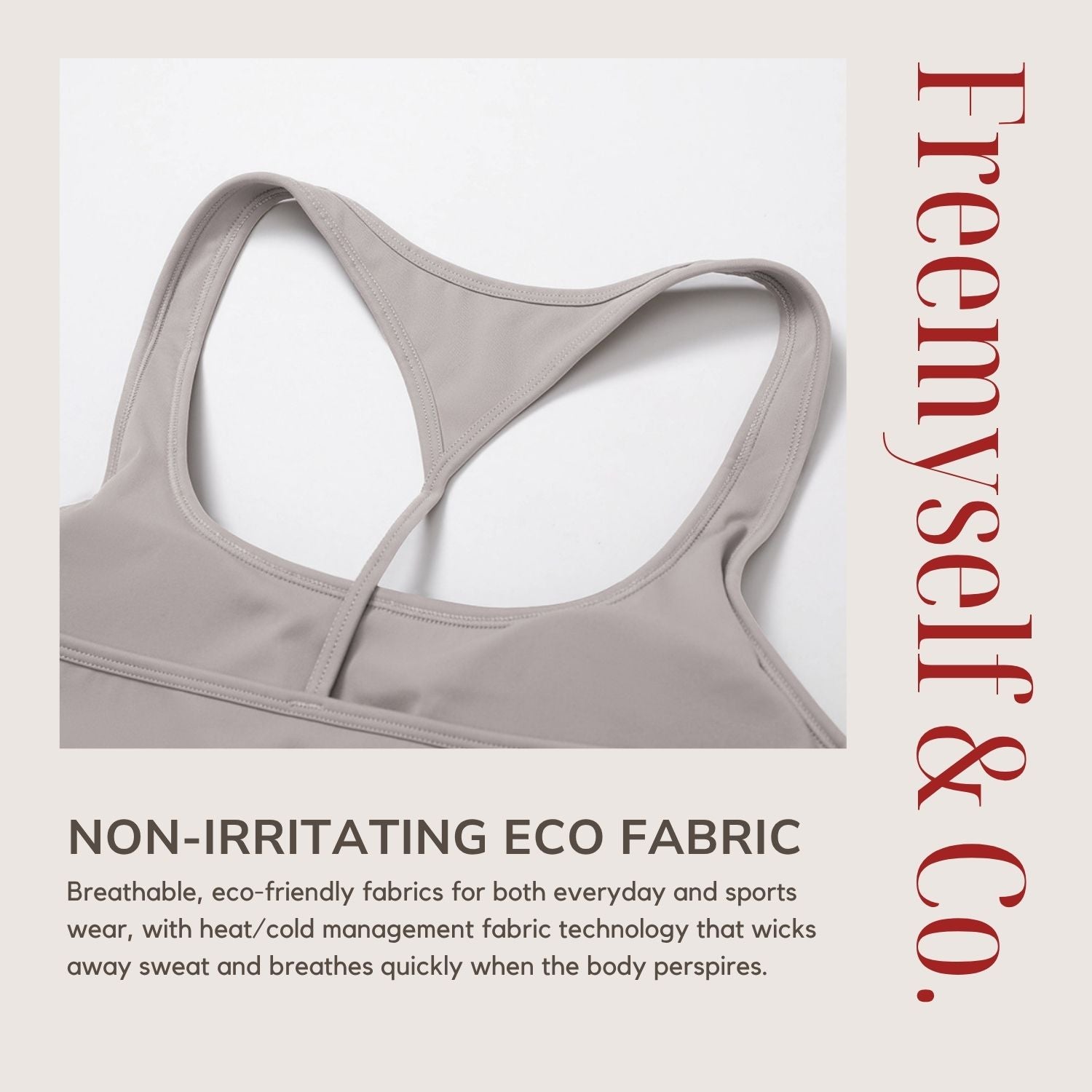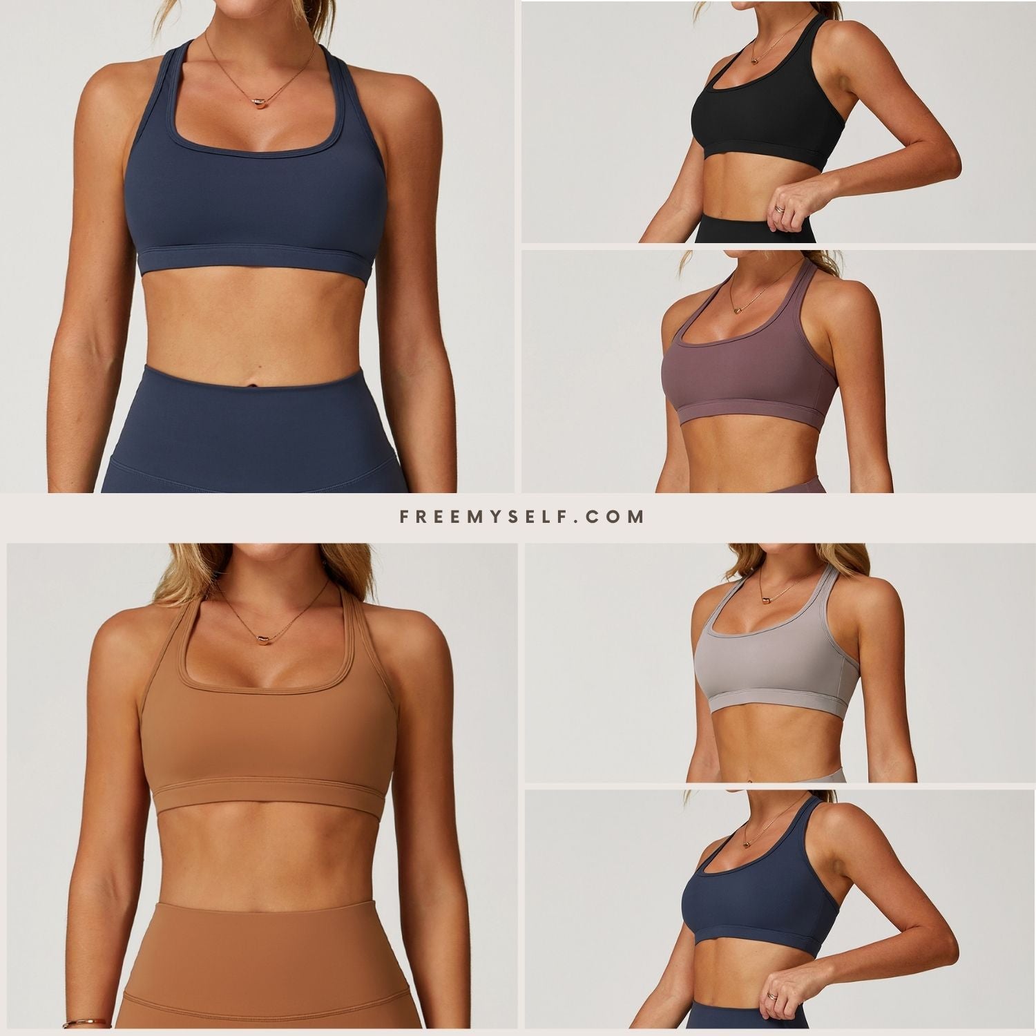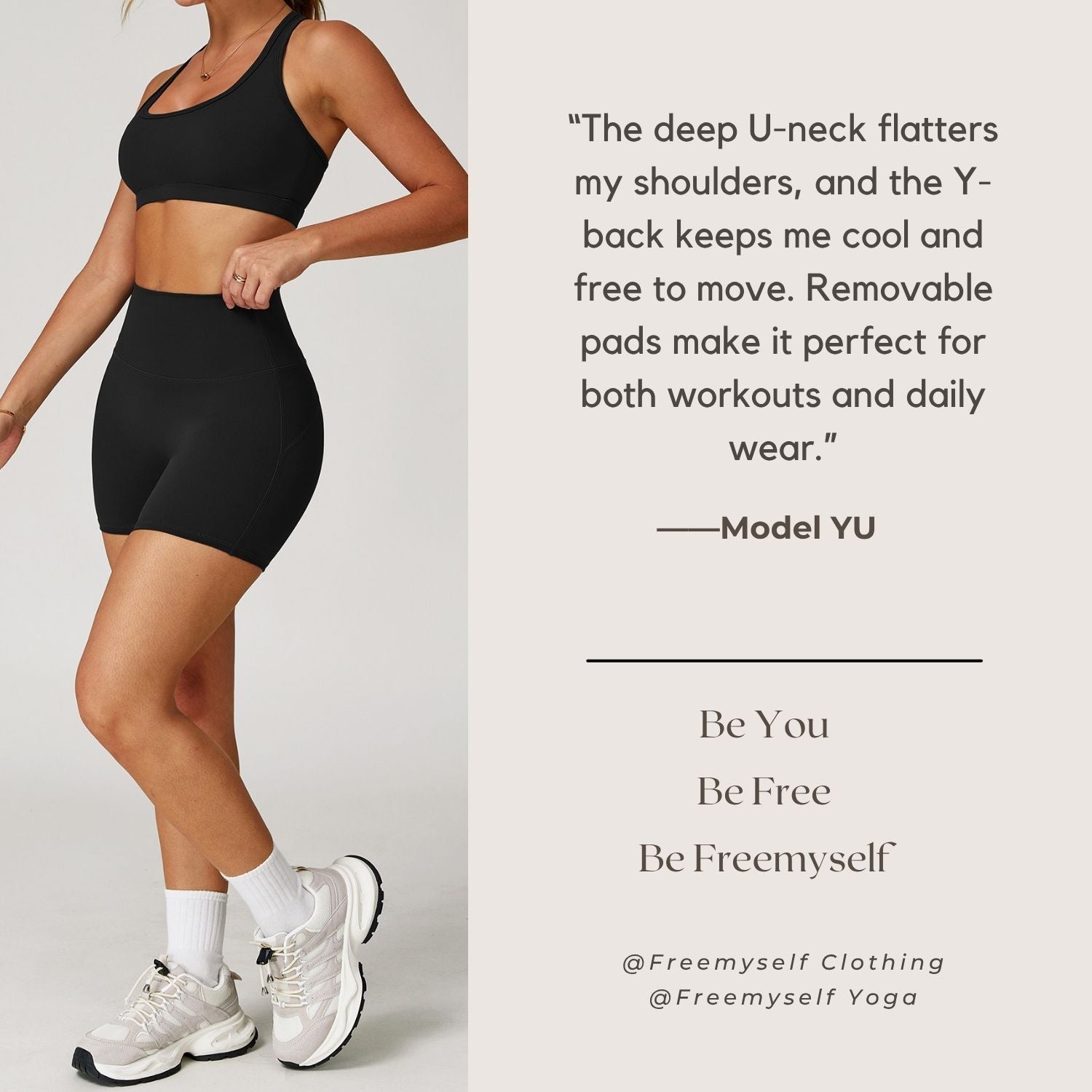 Freemyself 25ss yoga bra features a deep U-neckline that elongates the neckline, a Y-shaped open back for breathable freedom, and removable pads for easy wear without extra layers.