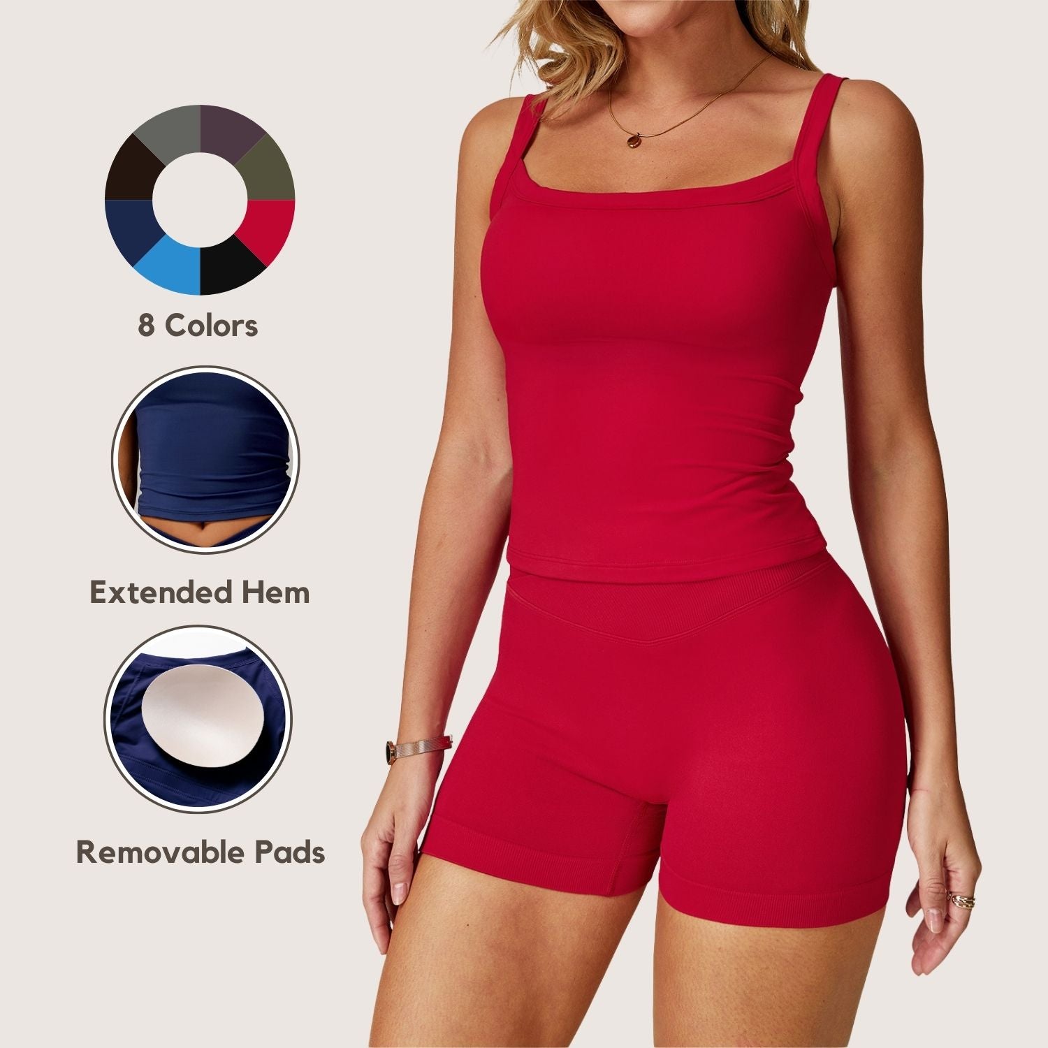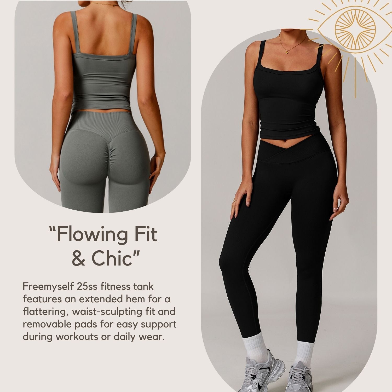 Freemyself 25ss fitness tank features an extended hem for a flattering, waist-sculpting fit and removable pads for easy support during workouts or daily wear.