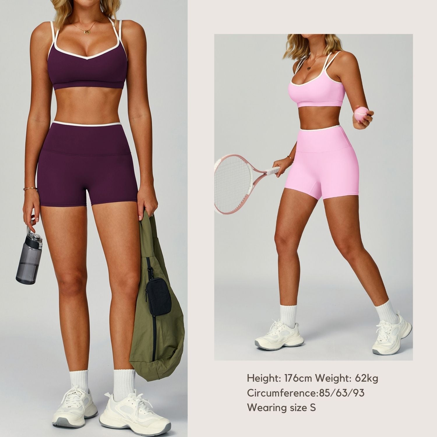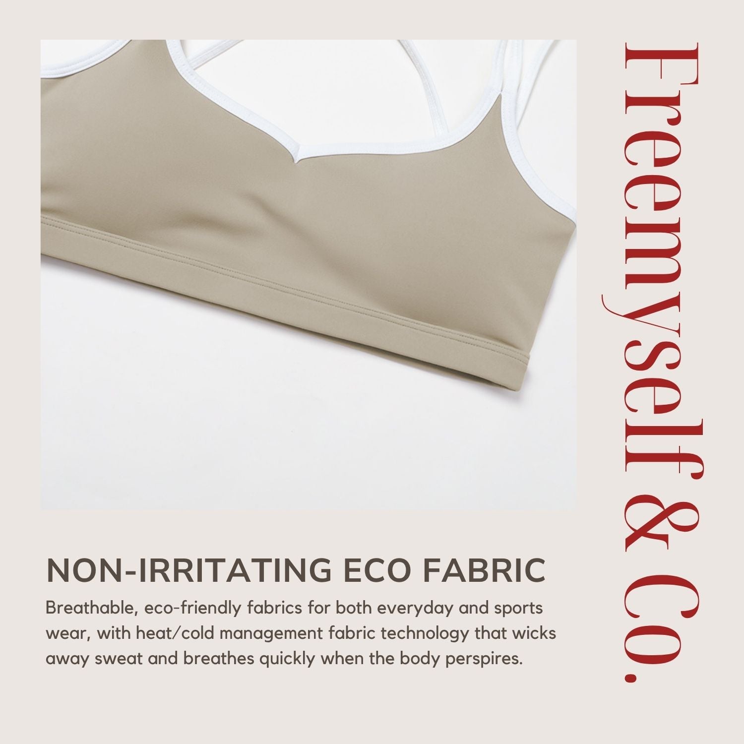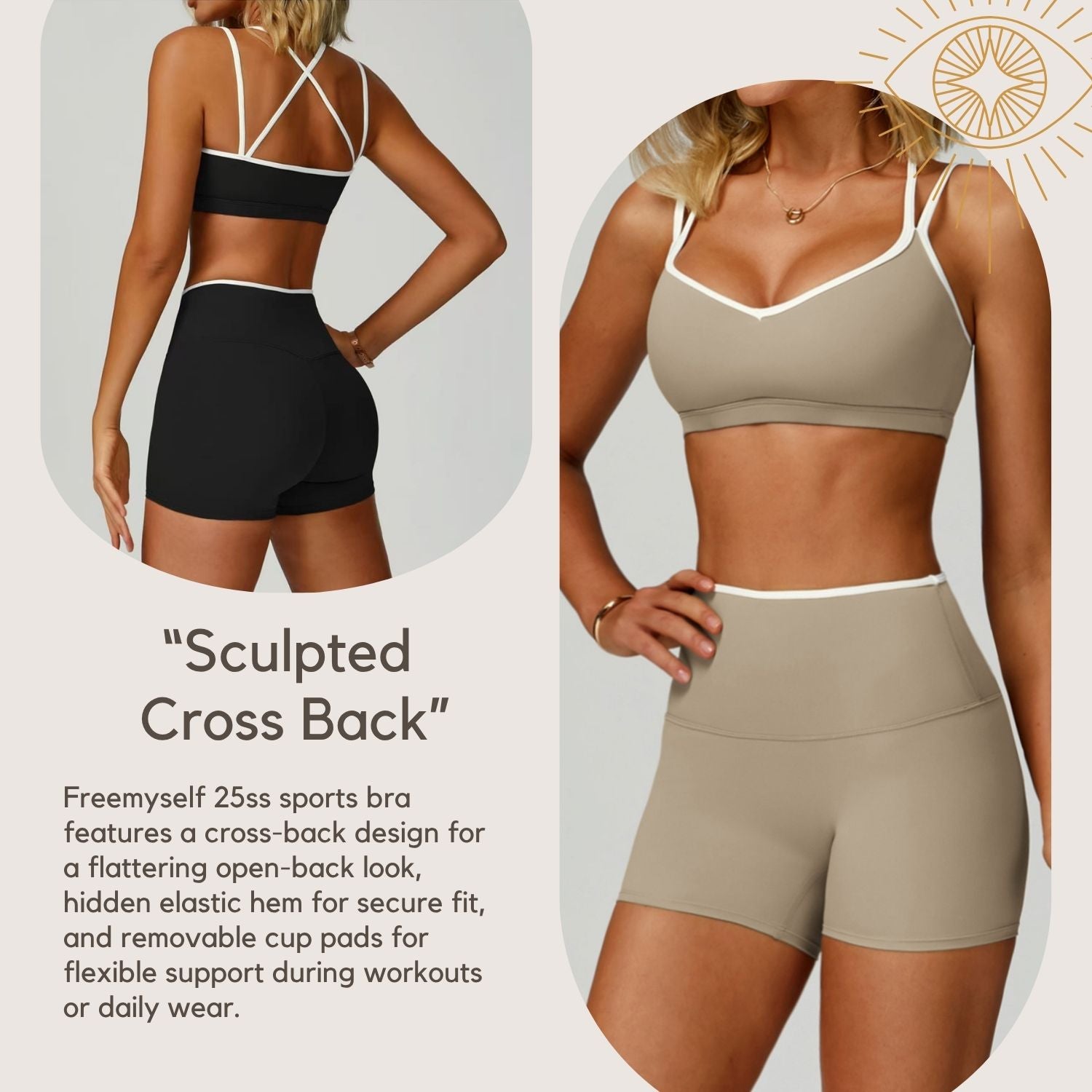 Freemyself 25ss sports bra features a cross-back design for a flattering open-back look, hidden elastic hem for secure fit, and removable cup pads for flexible support during workouts or daily wear.