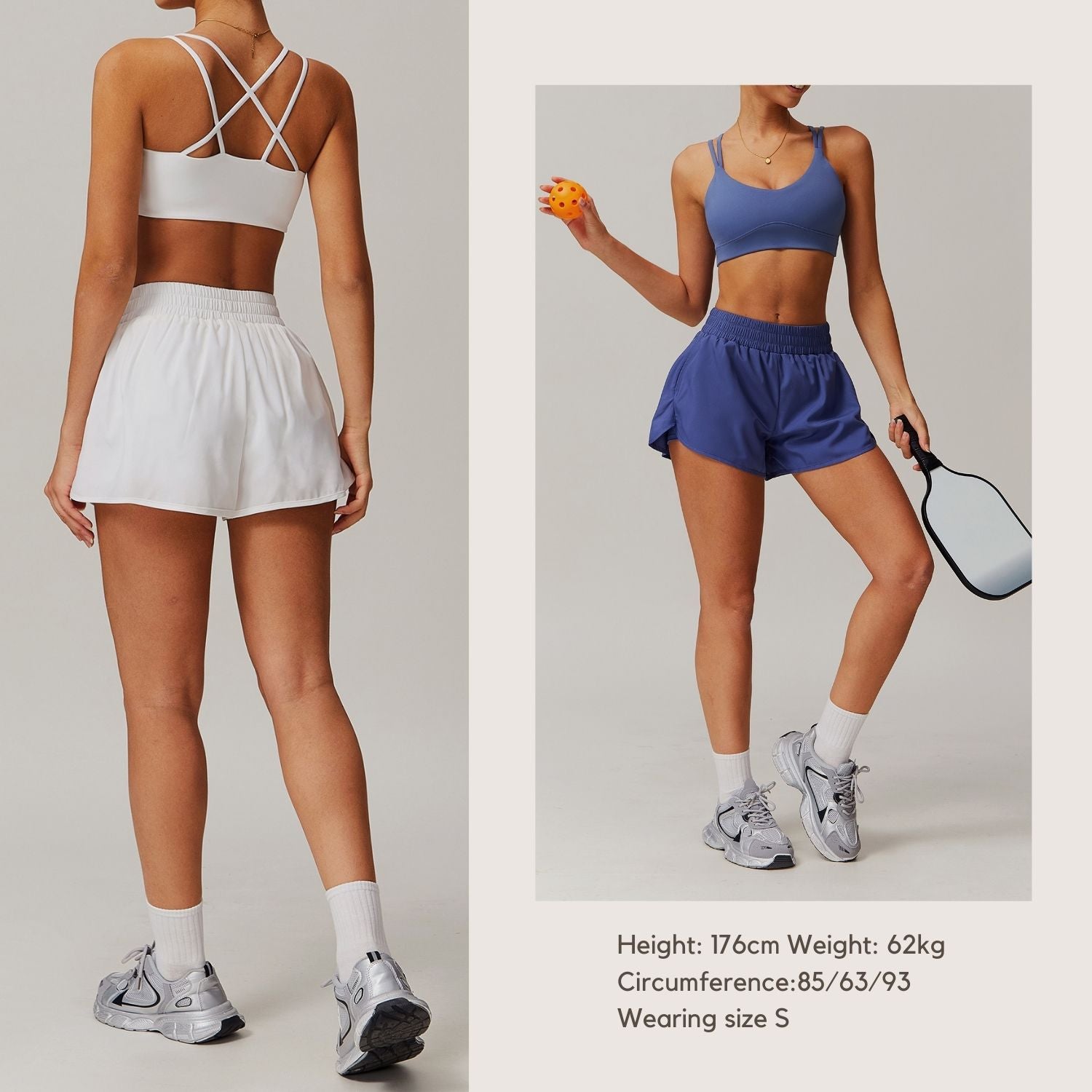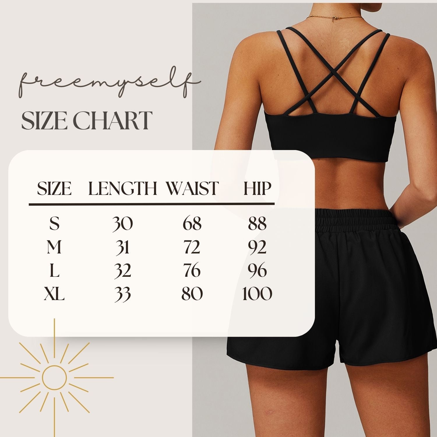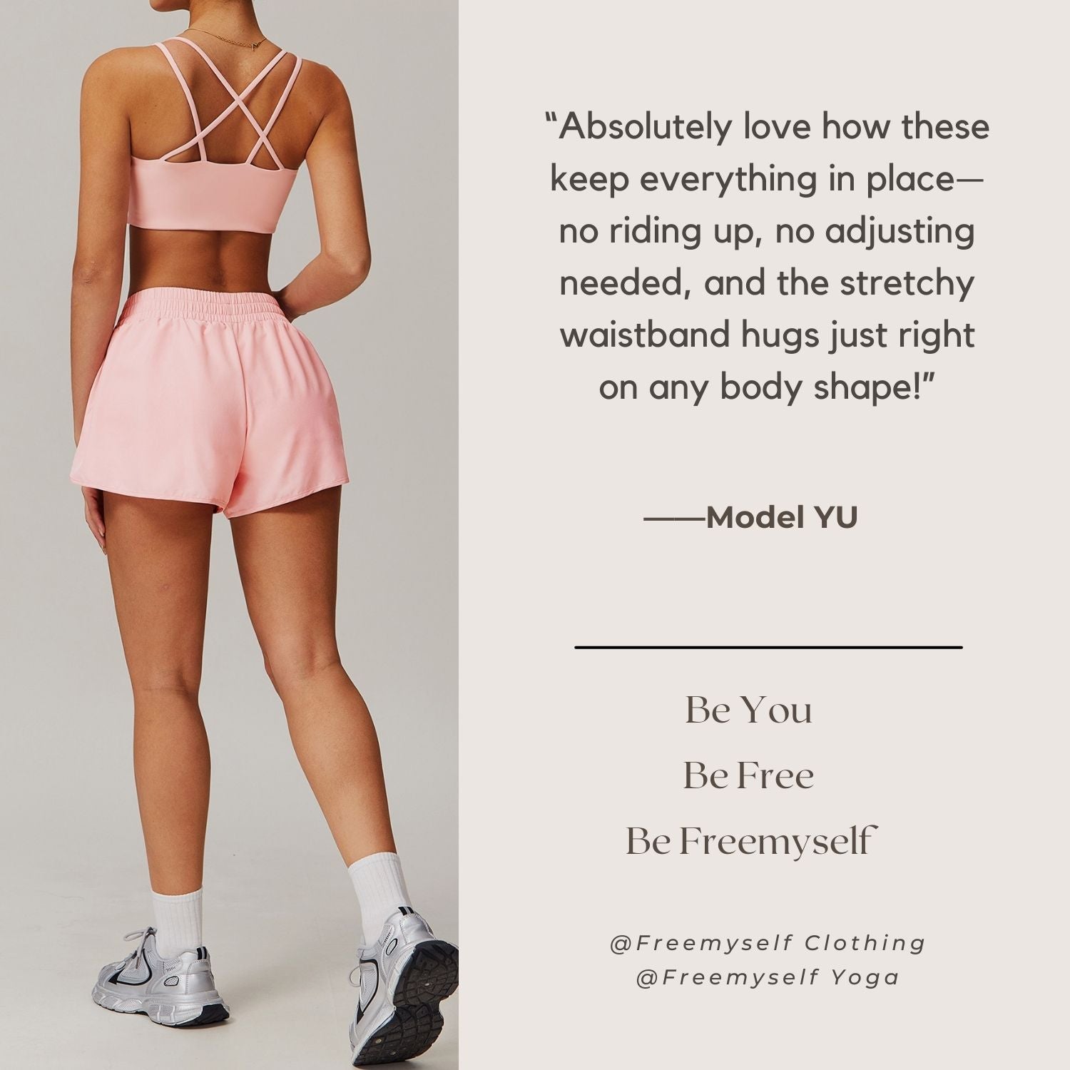 Freemyself 25ss faux two-piece yoga shorts feature an elastic waistband for easy wear and removal, accommodating different body types. The built-in anti-exposure lining is form-fitting without being tight.