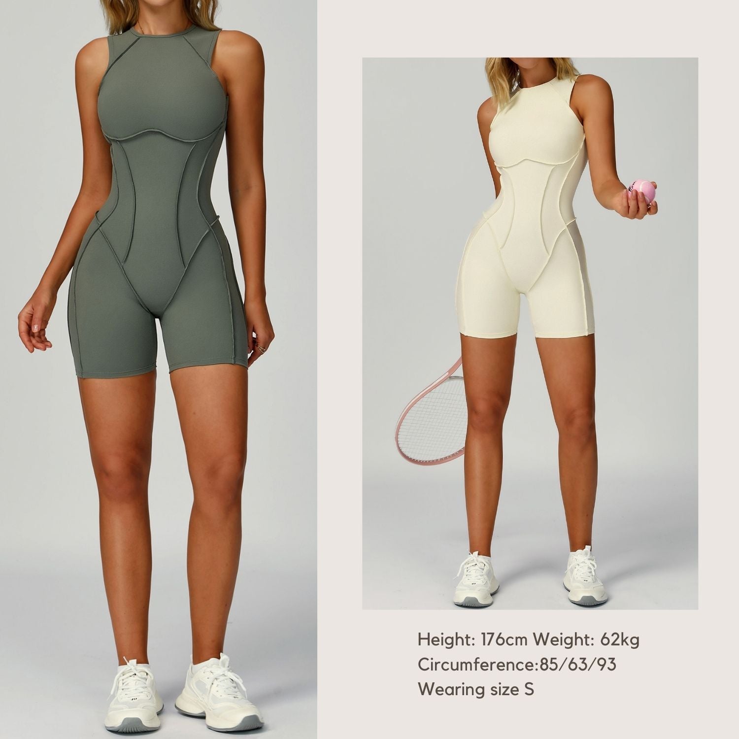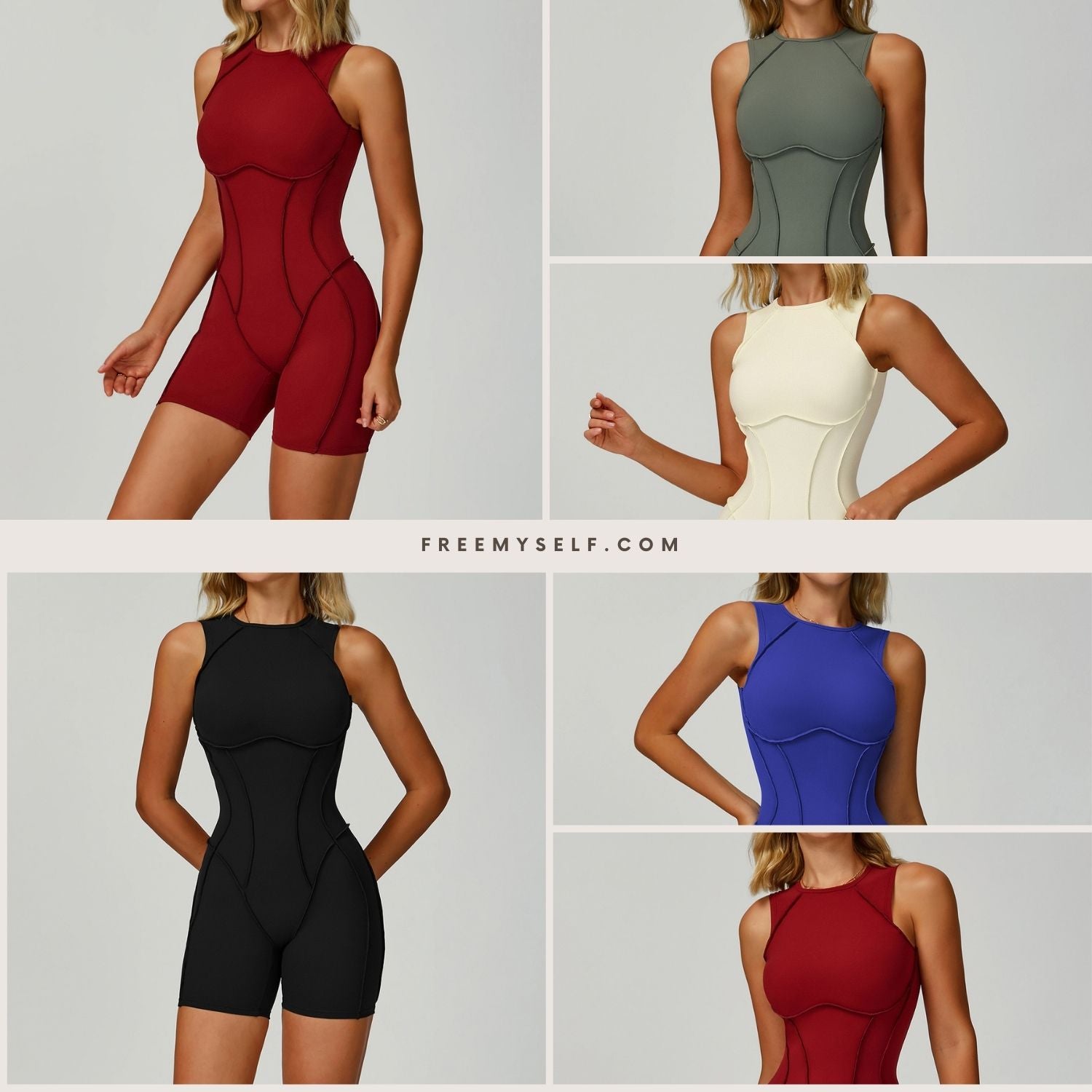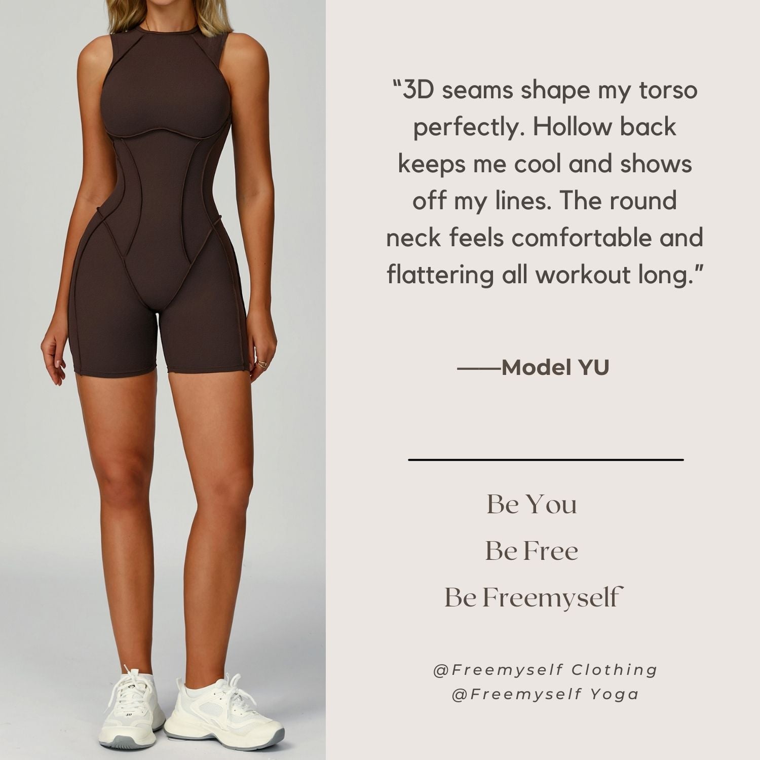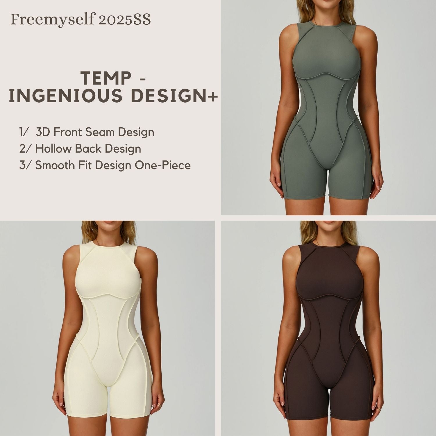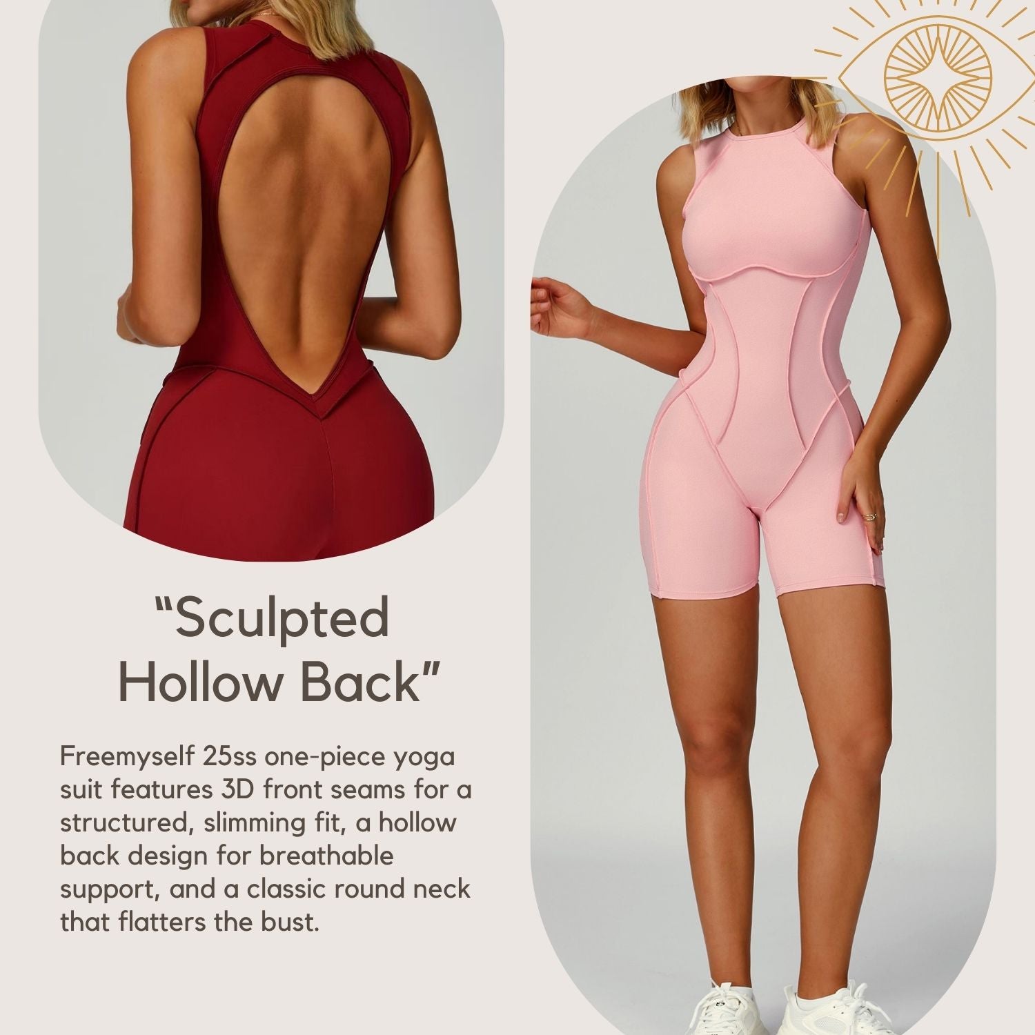 Freemyself 25ss one-piece yoga suit features 3D front seams for a structured, slimming fit, a hollow back design for breathable support, and a classic round neck that flatters the bust.