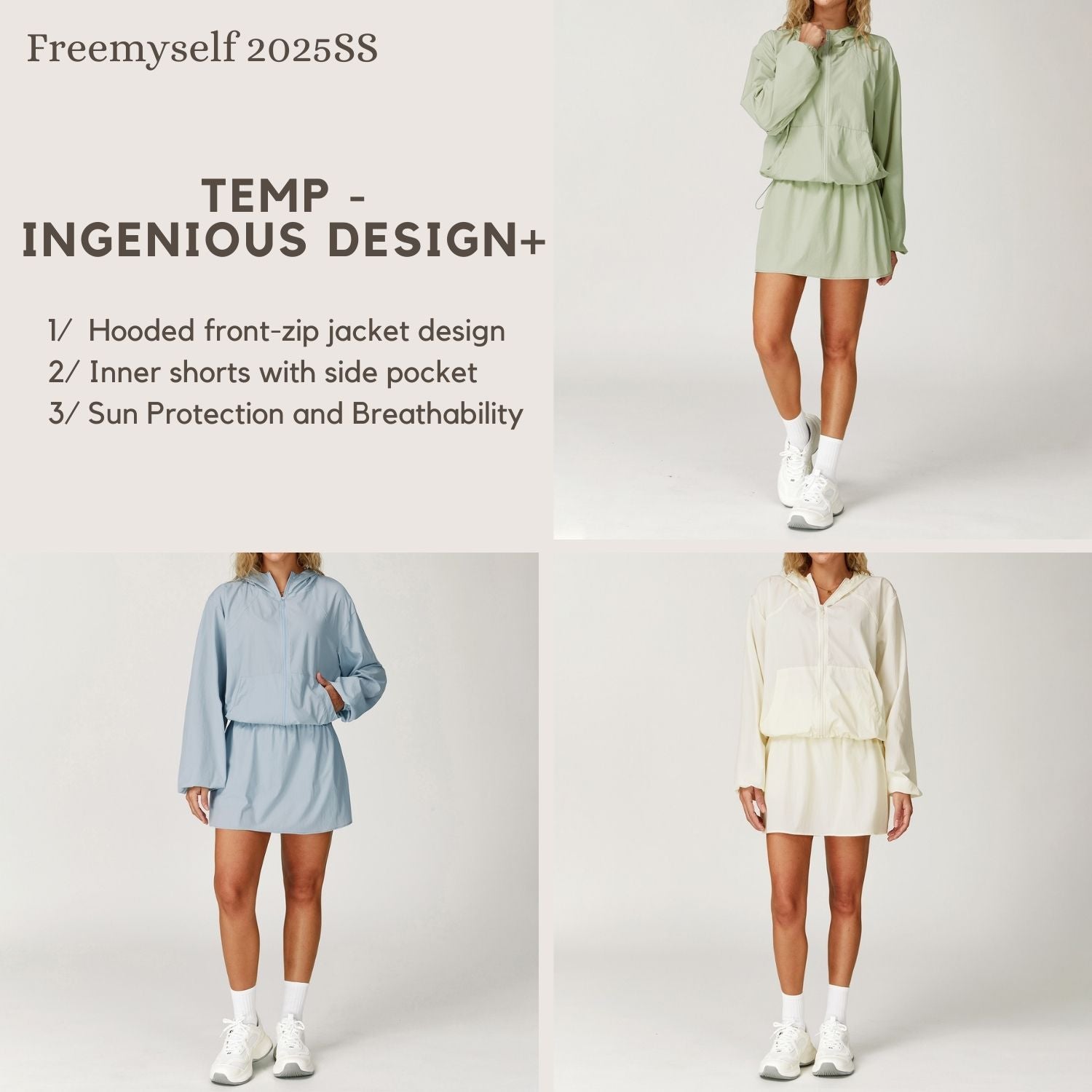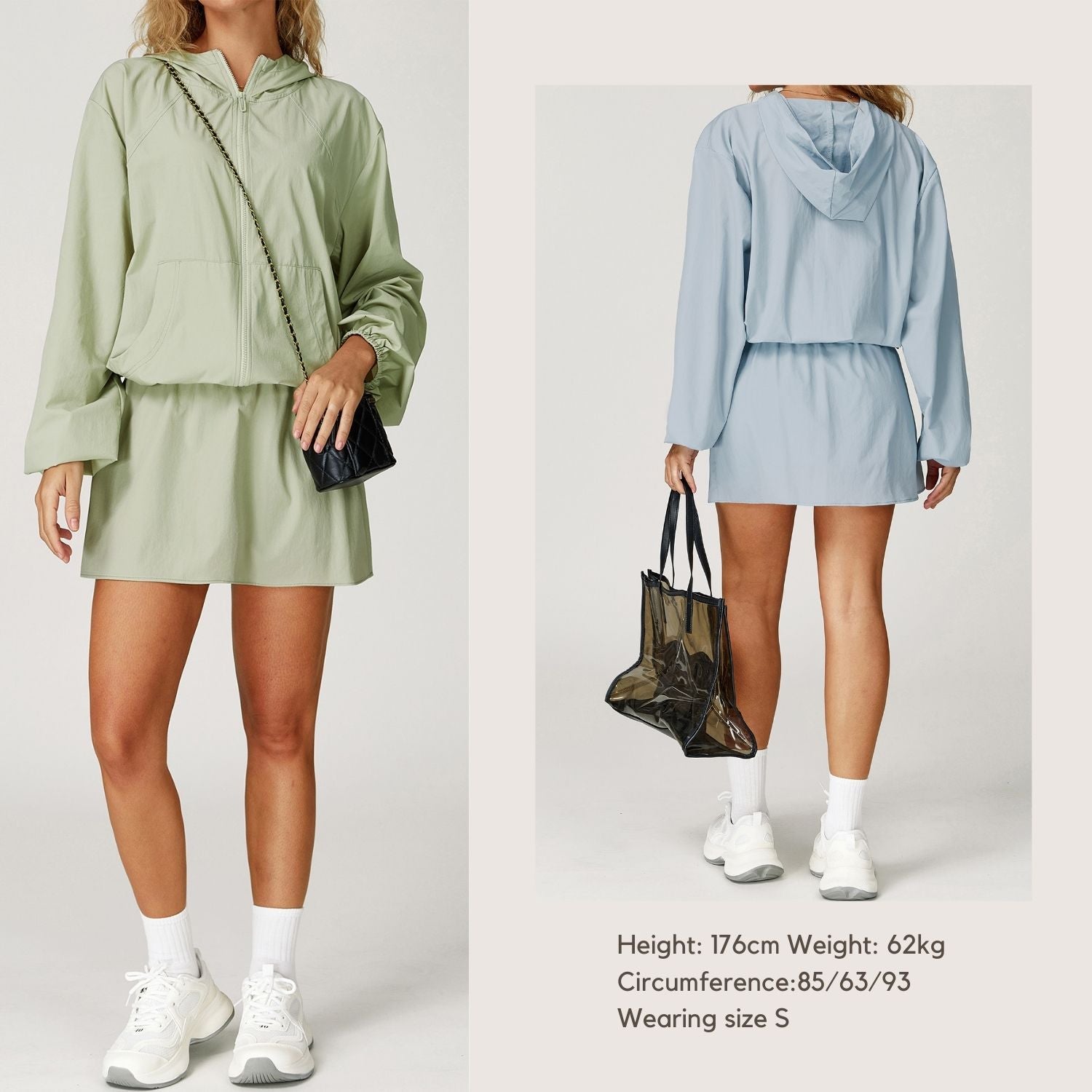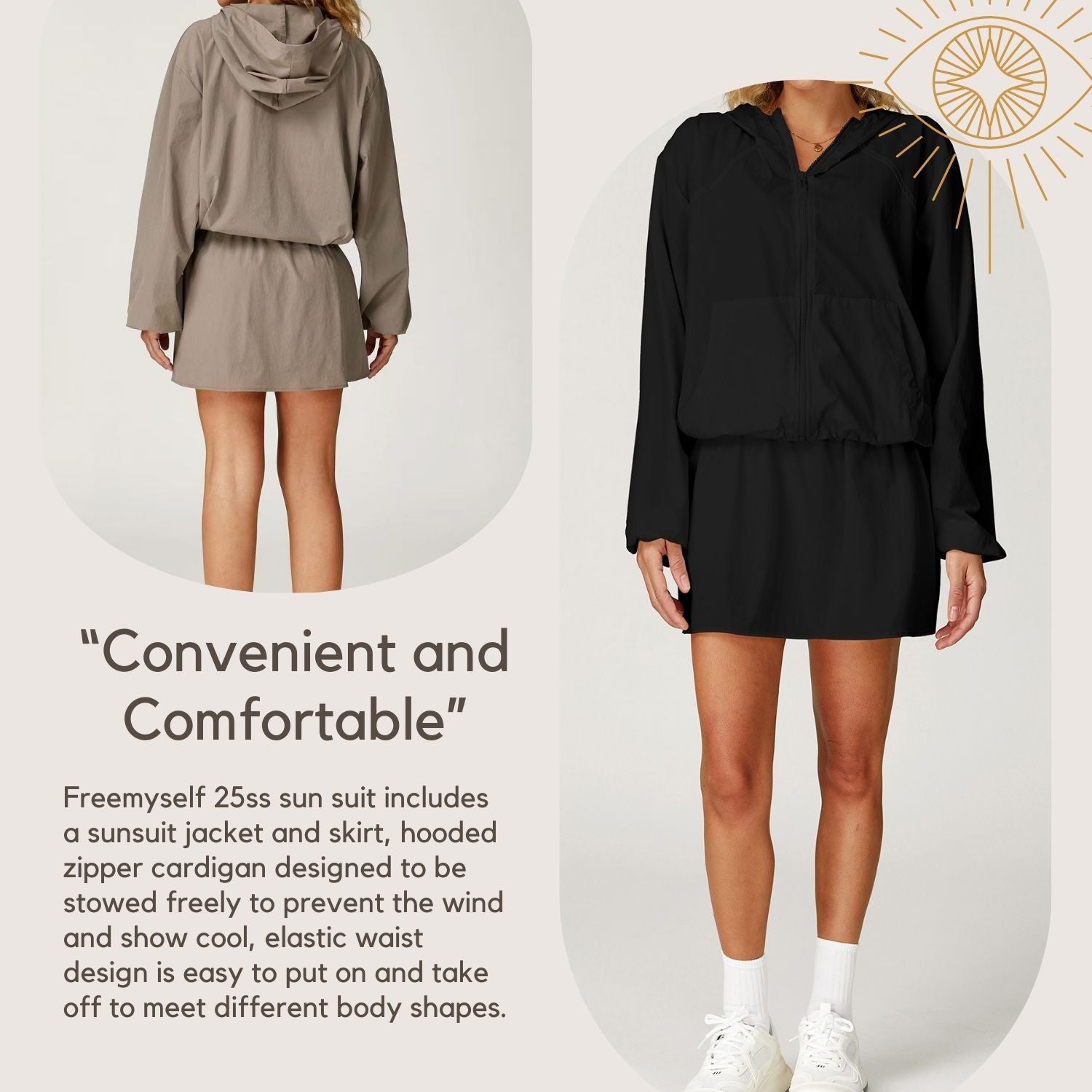 Freemyself 25ss sun suit includes a sunsuit jacket and skirt, hooded zipper cardigan designed to be stowed freely to prevent the wind and show cool, elastic waist design is easy to put on and take off to meet different body shapes.