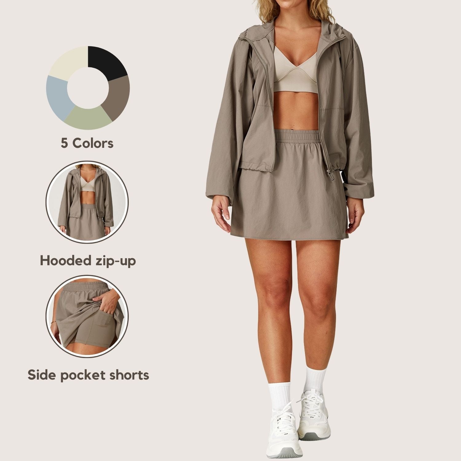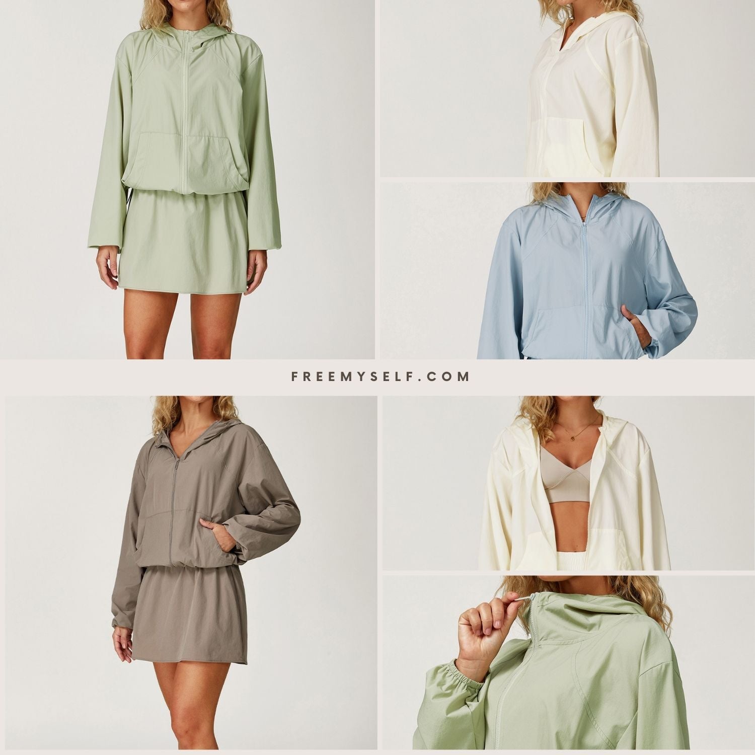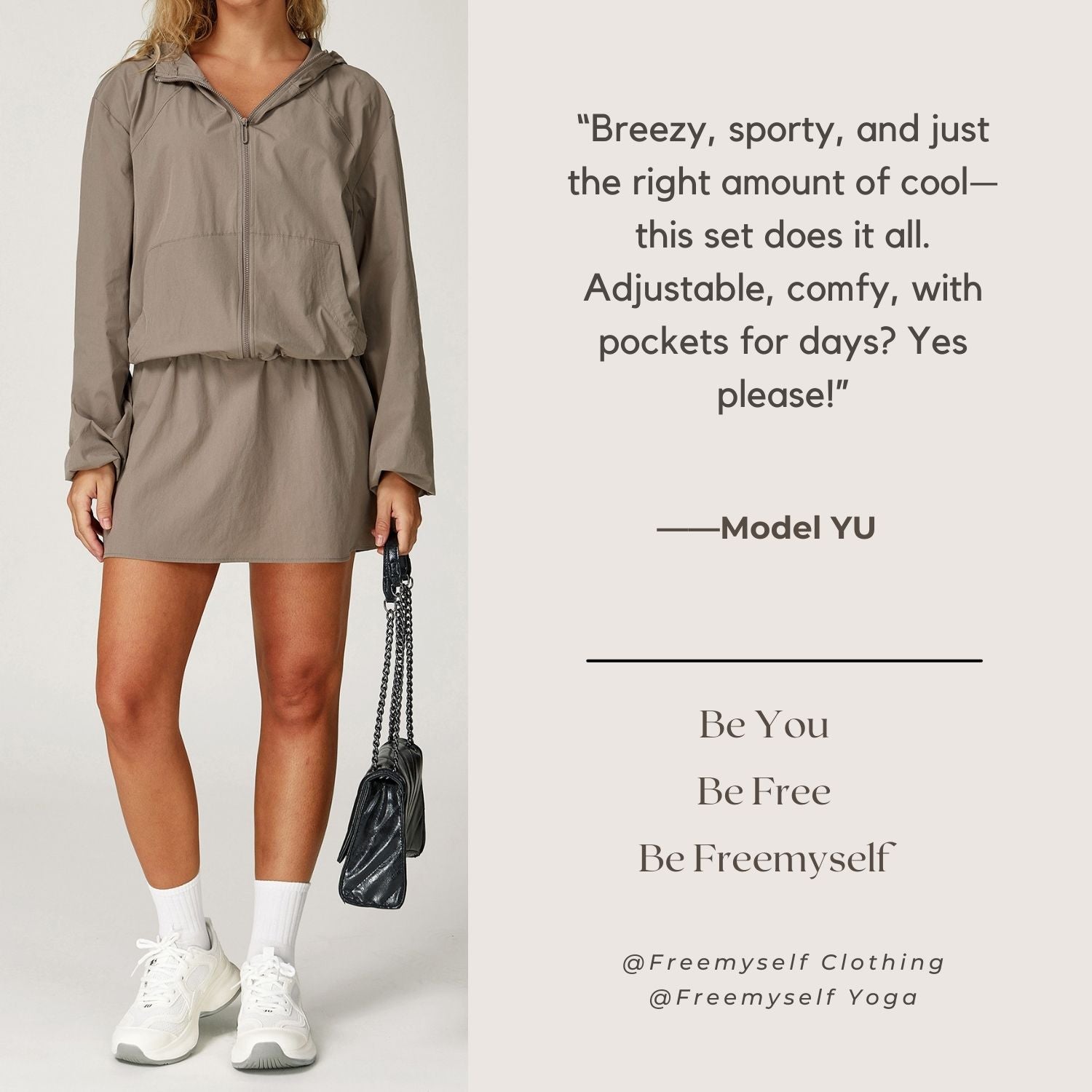 Freemyself 25ss sun suit includes a sunsuit jacket and skirt, hooded zipper cardigan designed to be stowed freely to prevent the wind and show cool, elastic waist design is easy to put on and take off to meet different body shapes.