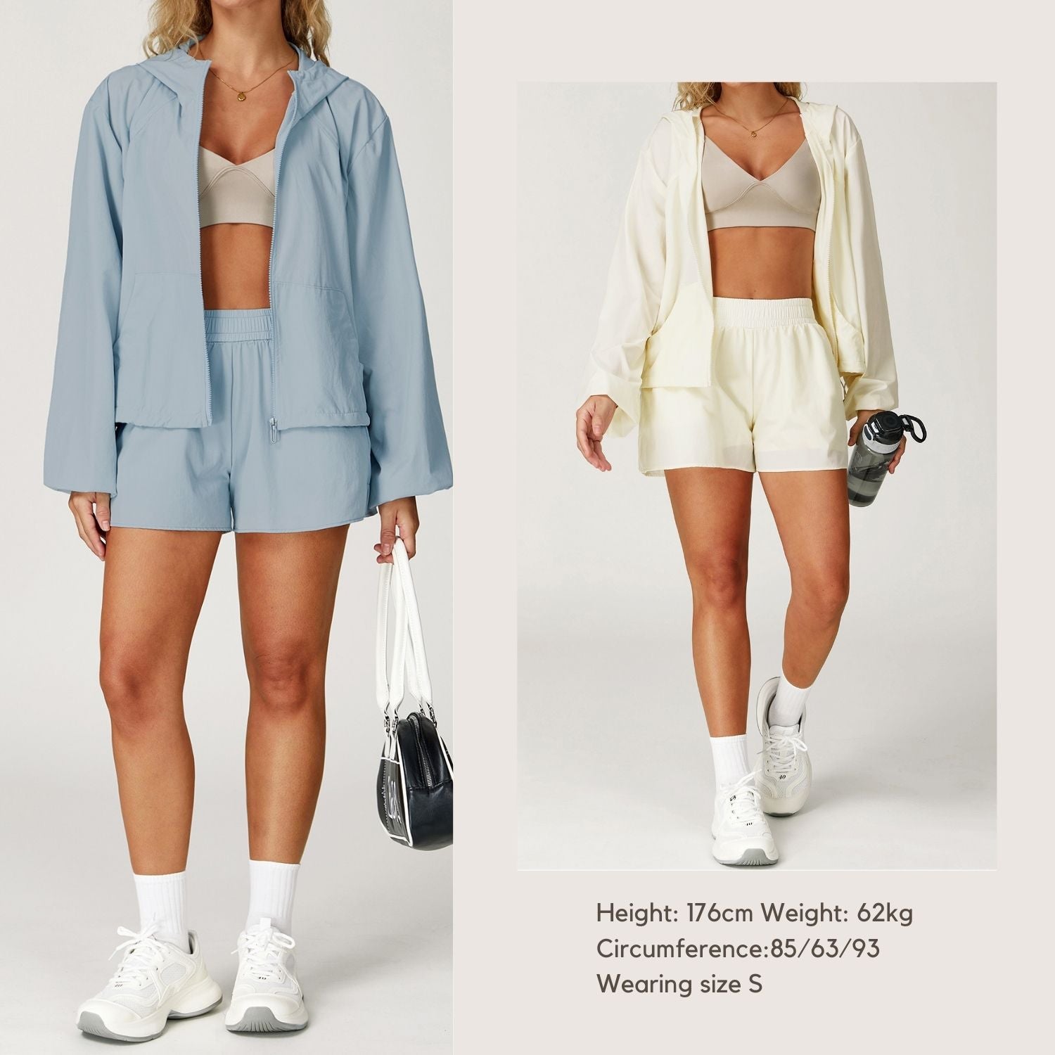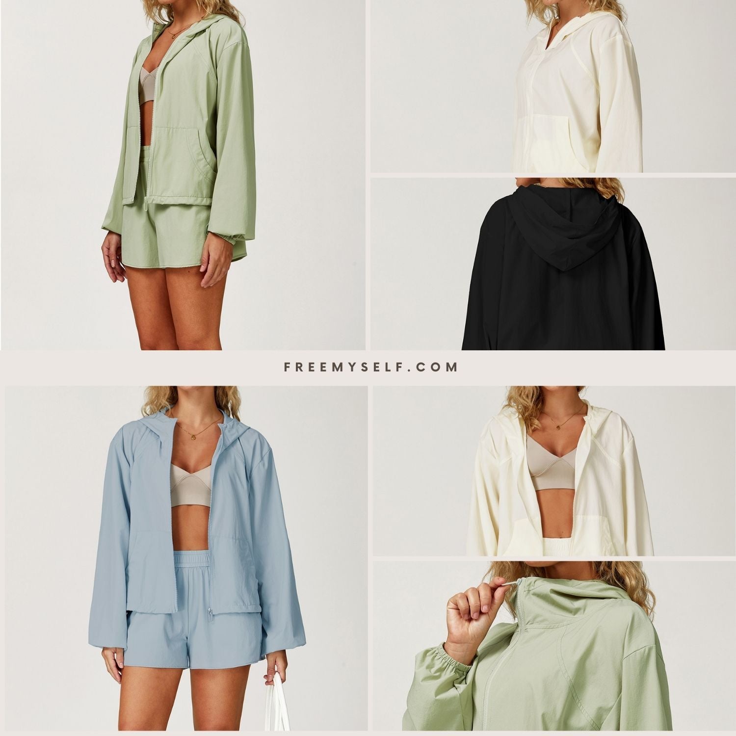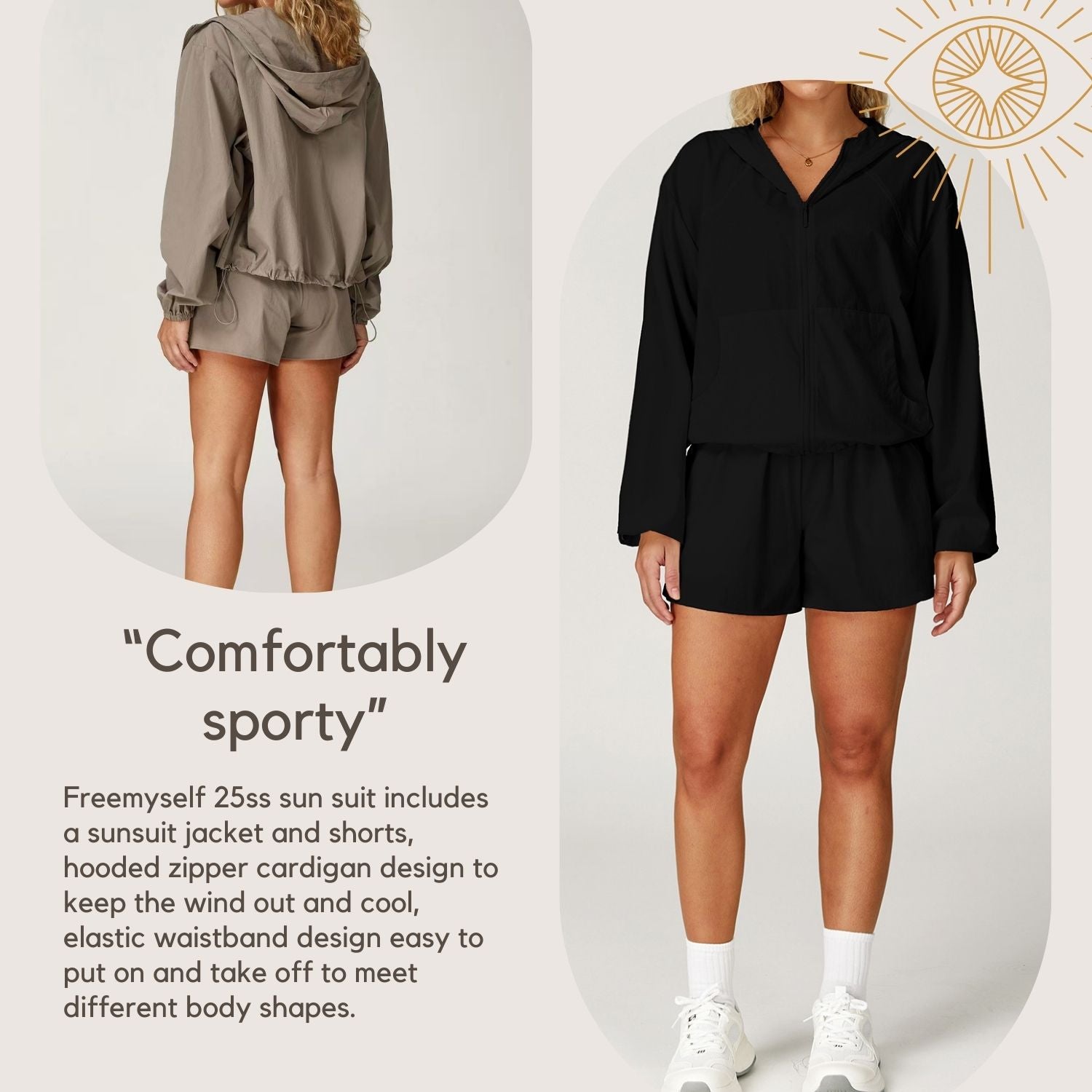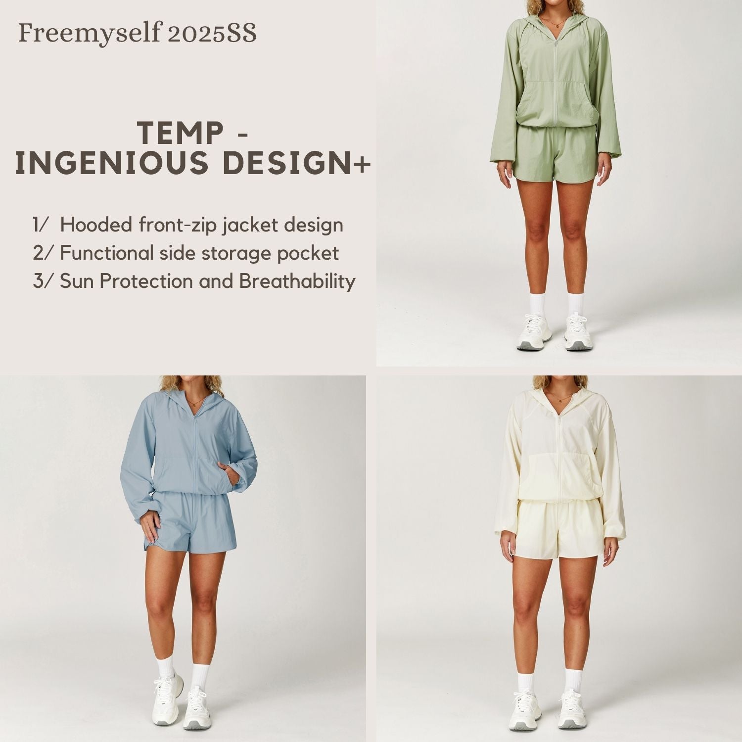 Freemyself 25ss sun suit includes a sunsuit jacket and shorts, hooded zipper cardigan design to keep the wind out and cool, elastic waistband design easy to put on and take off to meet different body shapes.