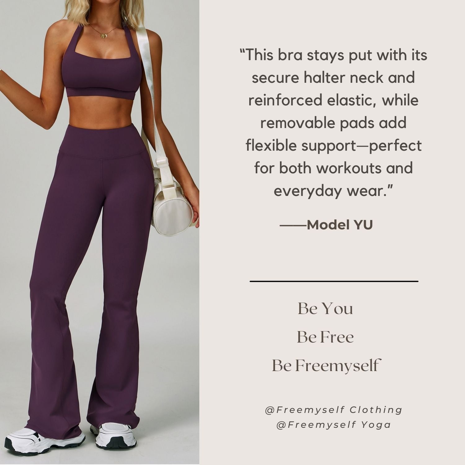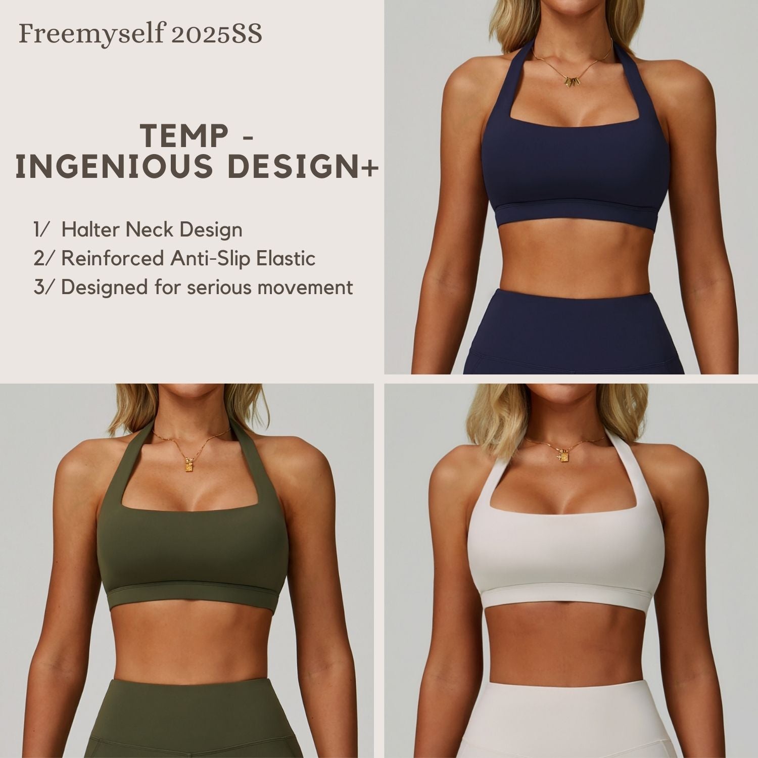 Freemyself 25ss Halter Bra offers a chic halter neck with reinforced anti-slip elastic for secure support, plus detachable chest pads for customizable comfort during any activity.