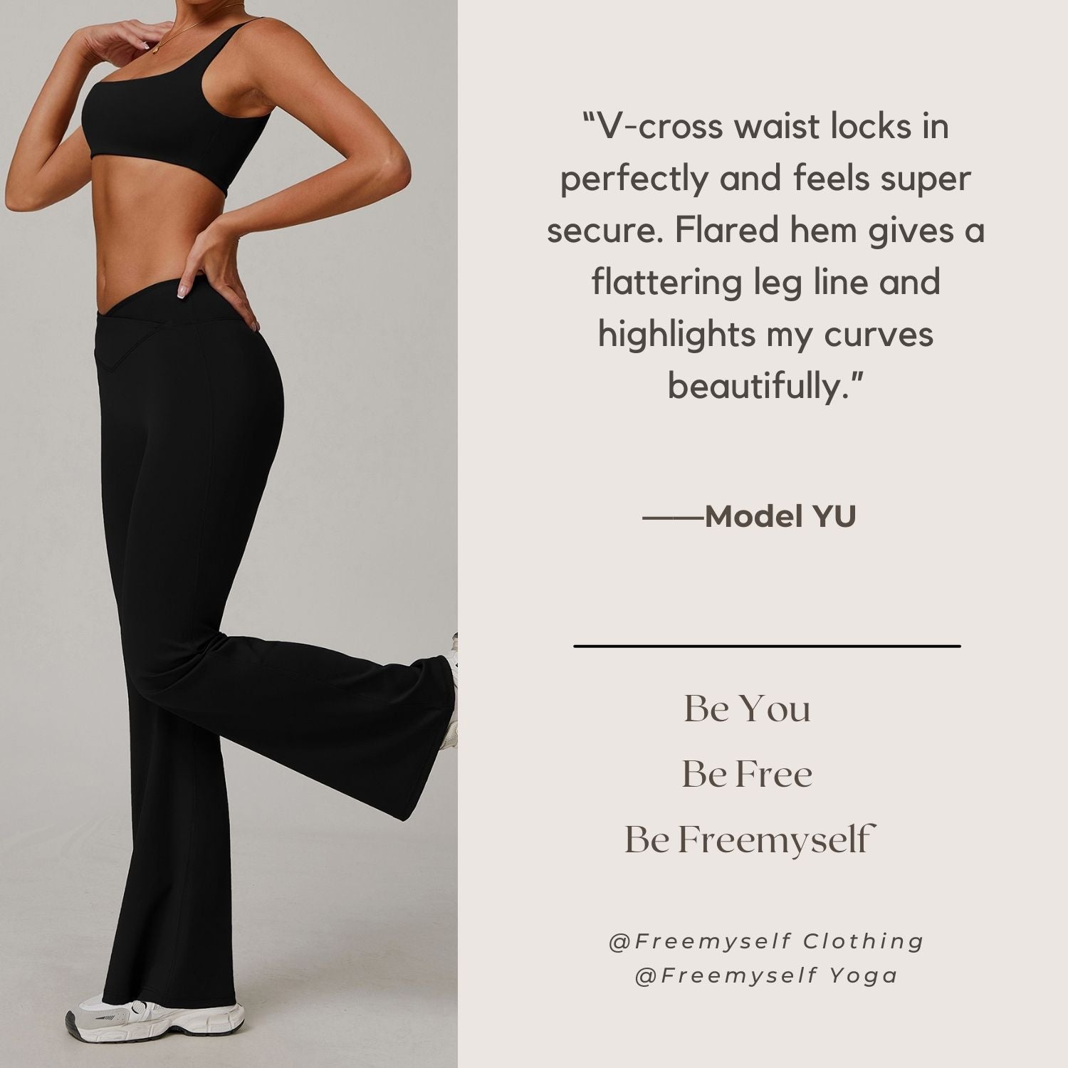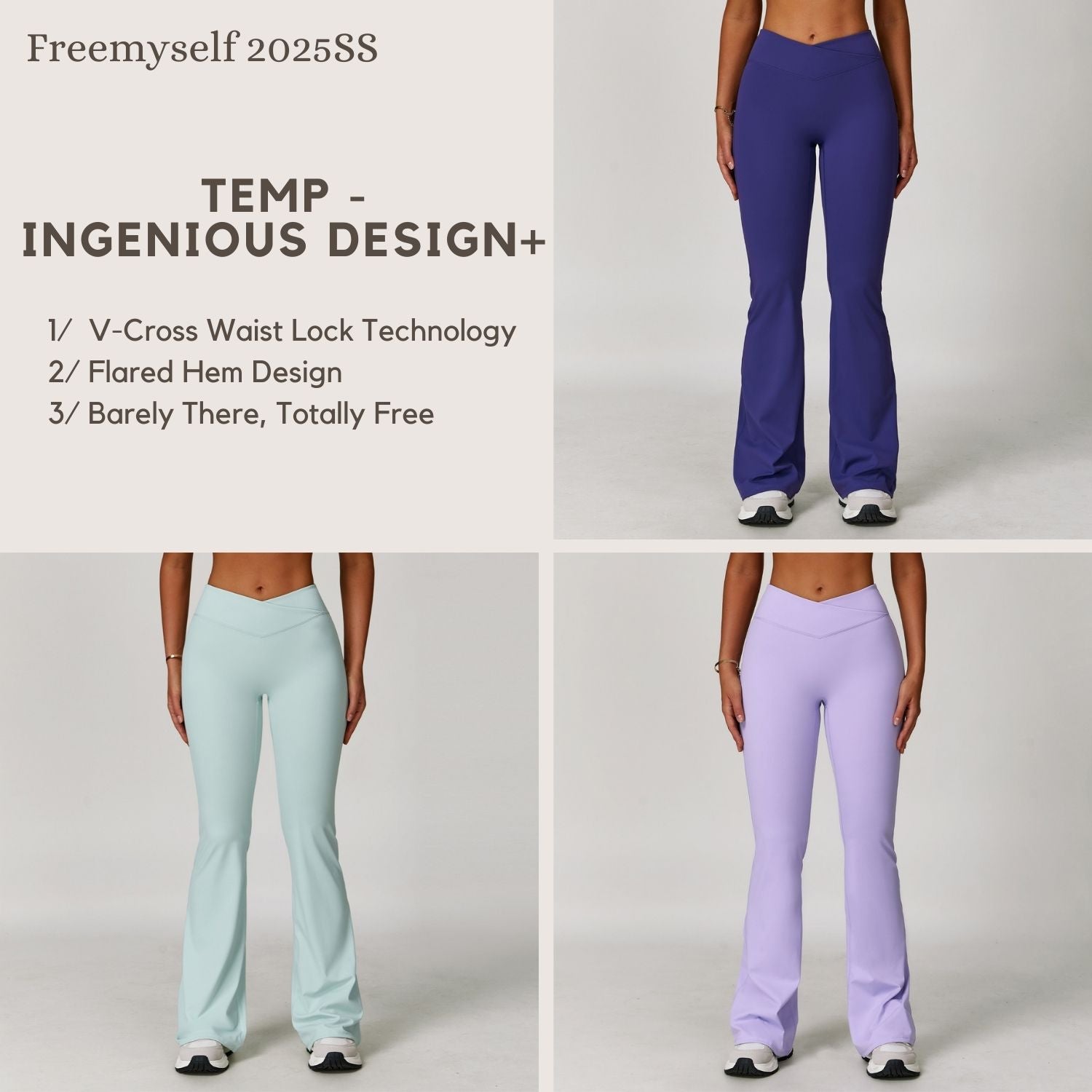 Freemyself 25ss high-waist flare leggings feature V-cross waist lock technology for a secure fit, a flared hem design to elongate legs, and a high-rise style that shapes the waist and enhances curves.