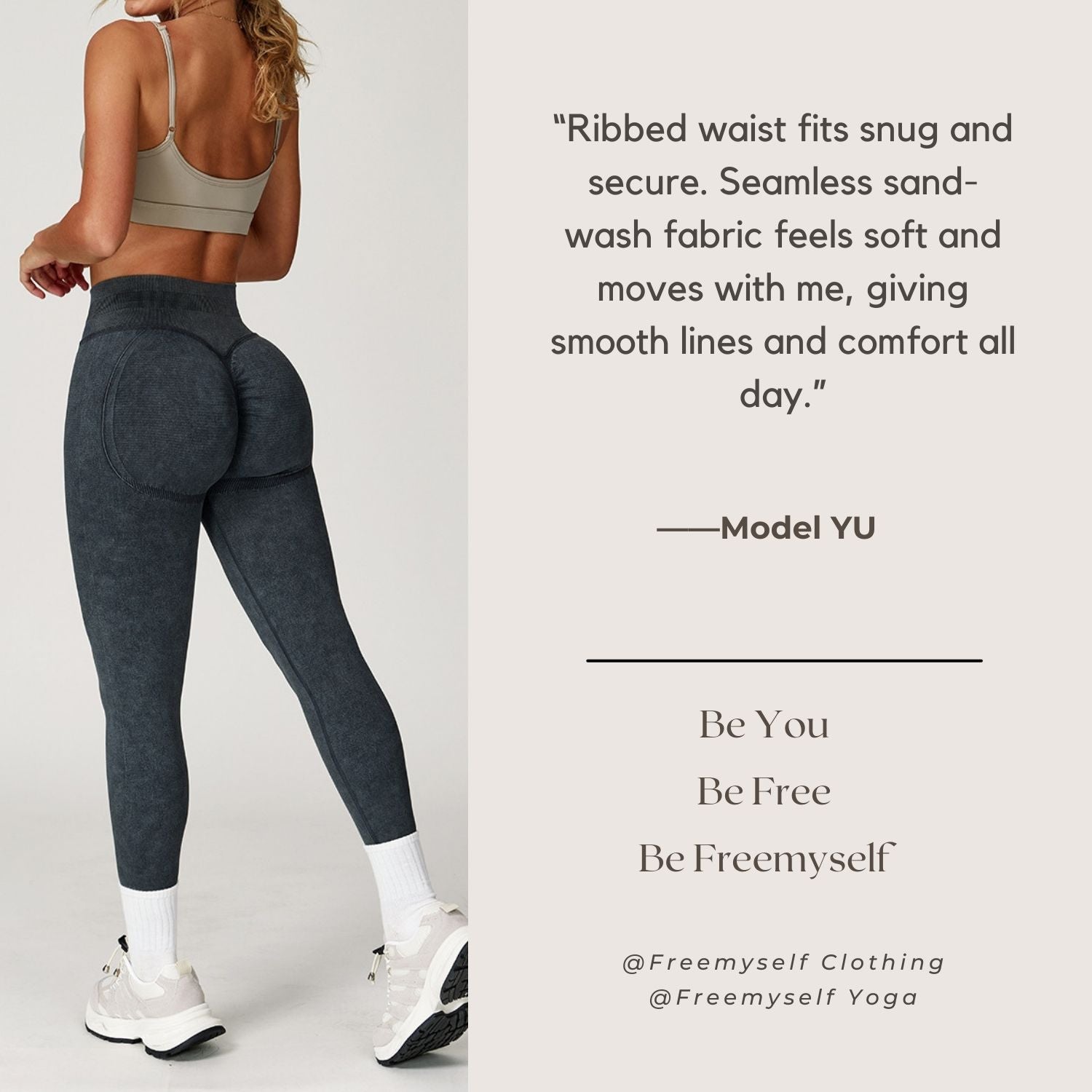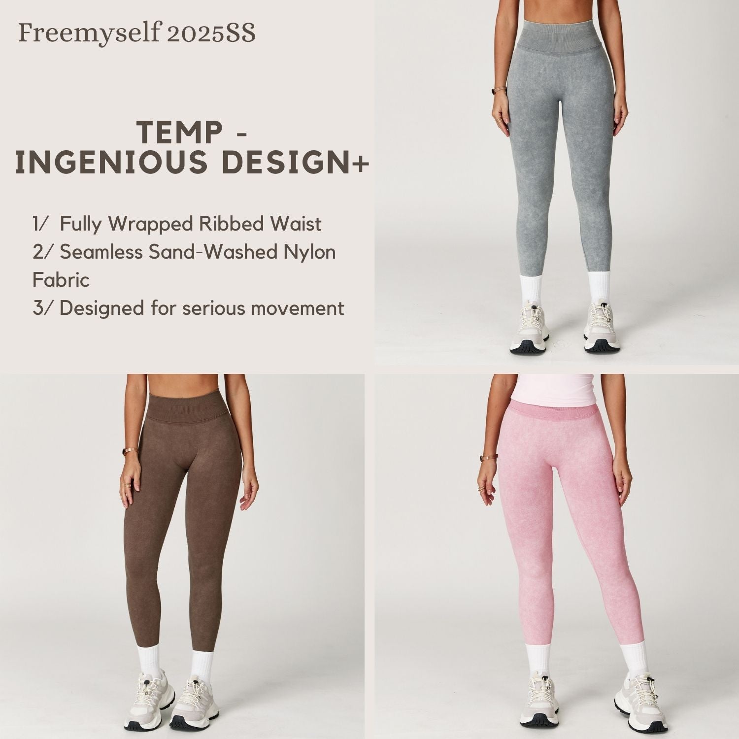Freemyself 25ss sand-wash leggings feature a fully wrapped ribbed waist for secure fit and seamless sand-washed nylon fabric for smooth, comfortable wear with a flattering silhouette.