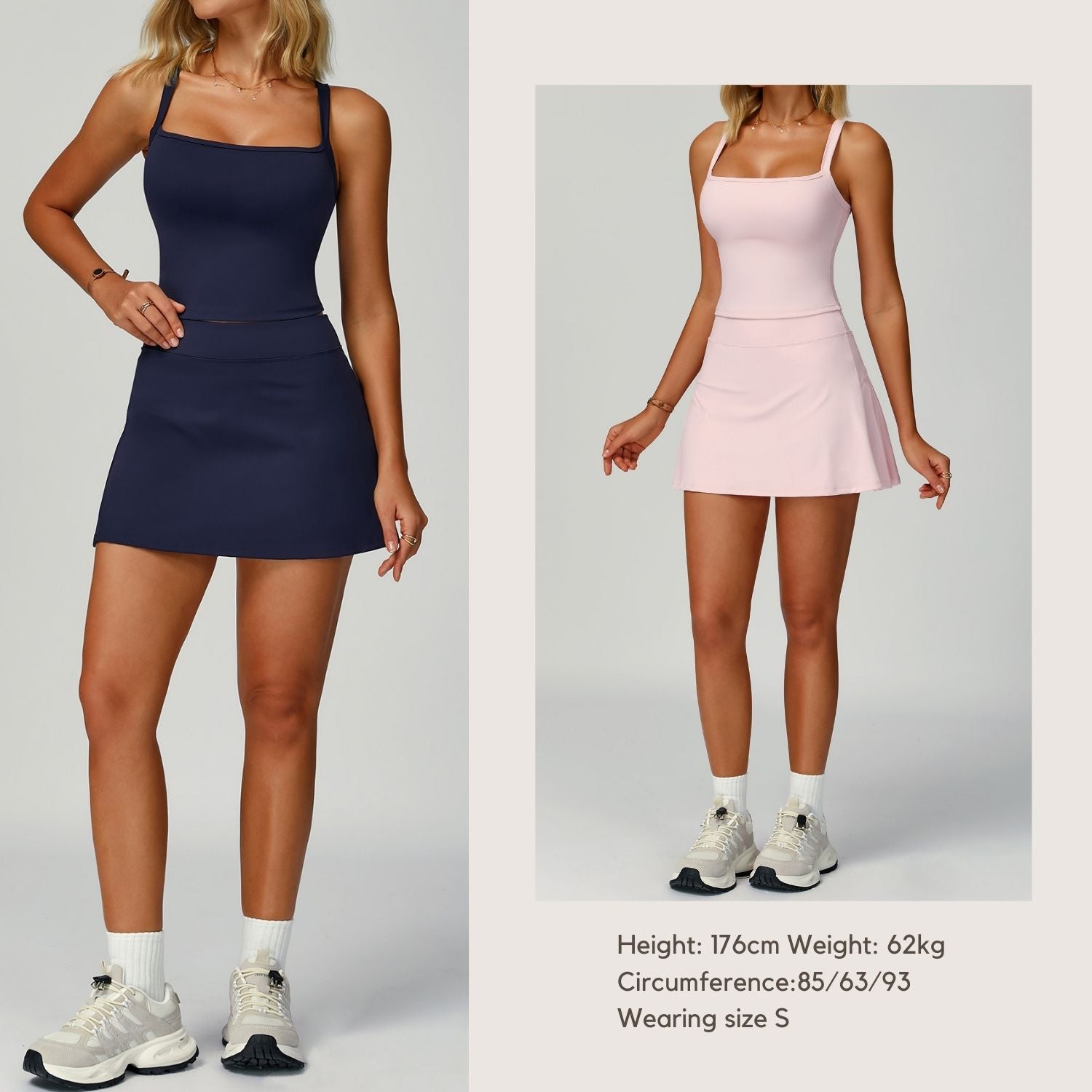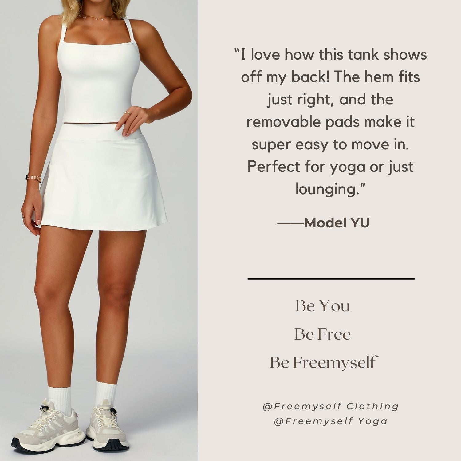 Freemyself 25ss yoga tank features a cutout back for airflow and freedom. The extended hem fits snugly and comfortably, while removable pads provide adjustable support for any workout.