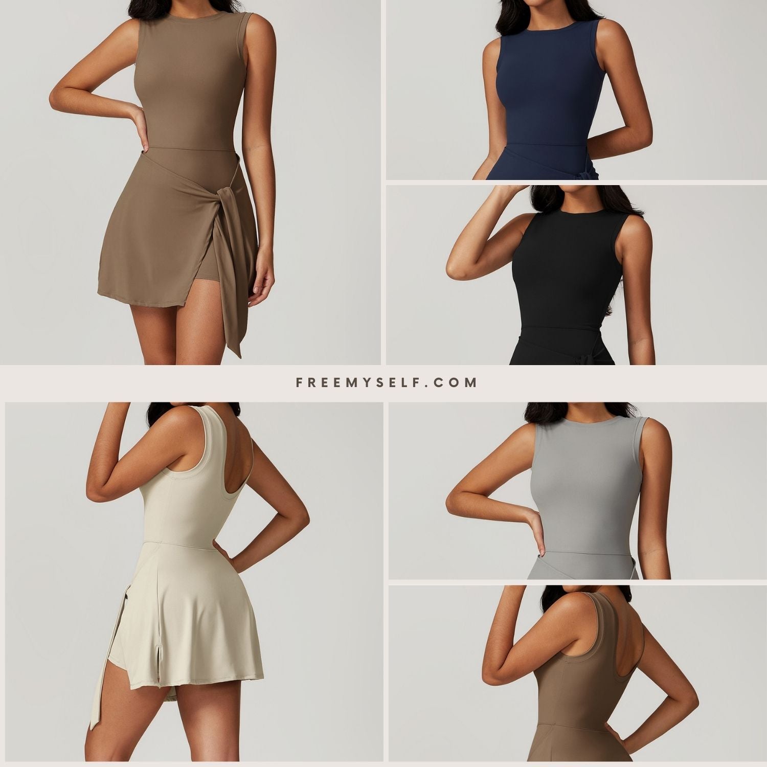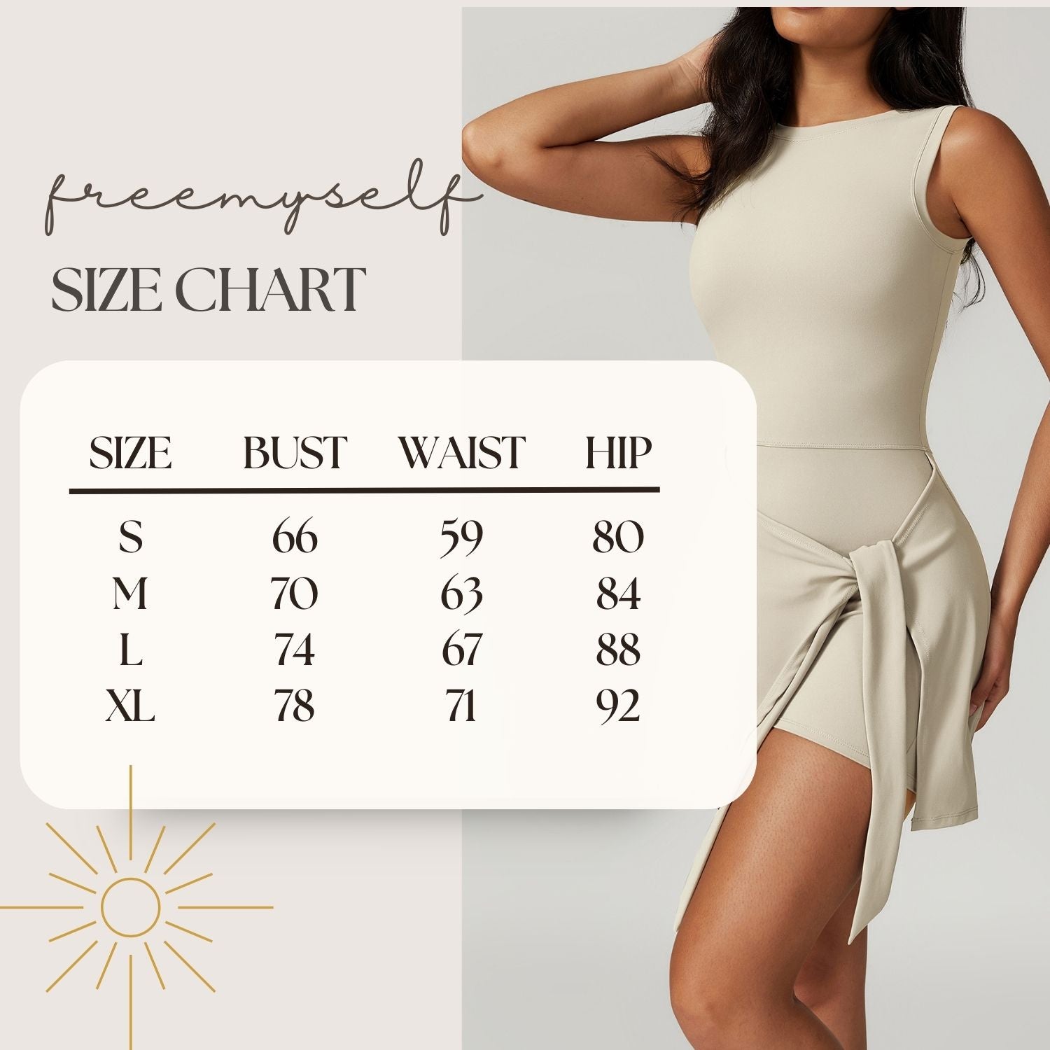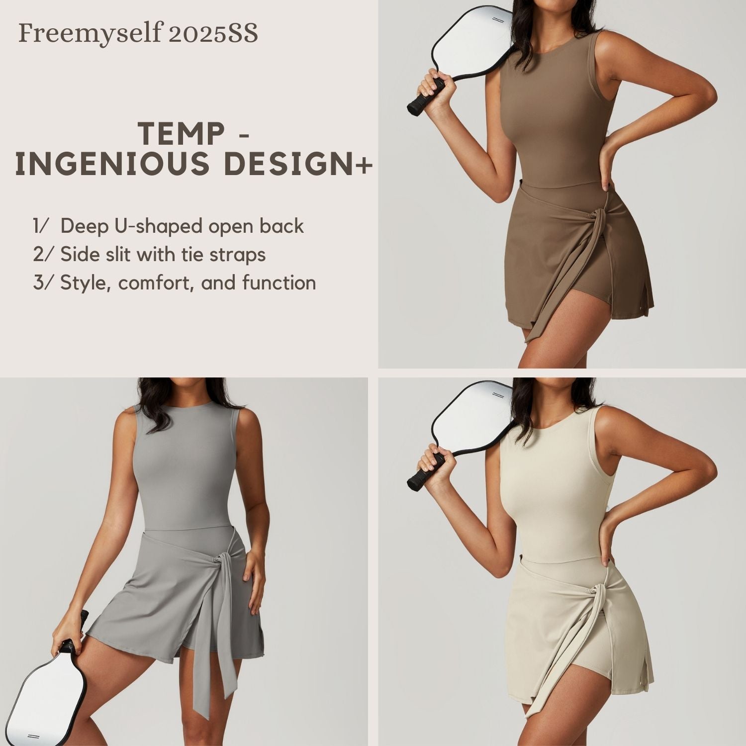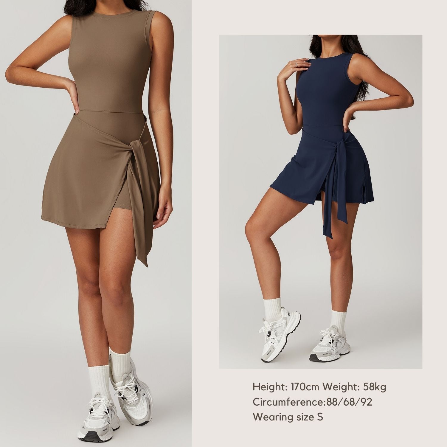 Freemyself 25ss faux two-piece tie-up tennis skirt features a sexy U-shaped back that shows off your elegant butterfly bones, with a sexy slit and adjustable elastic.