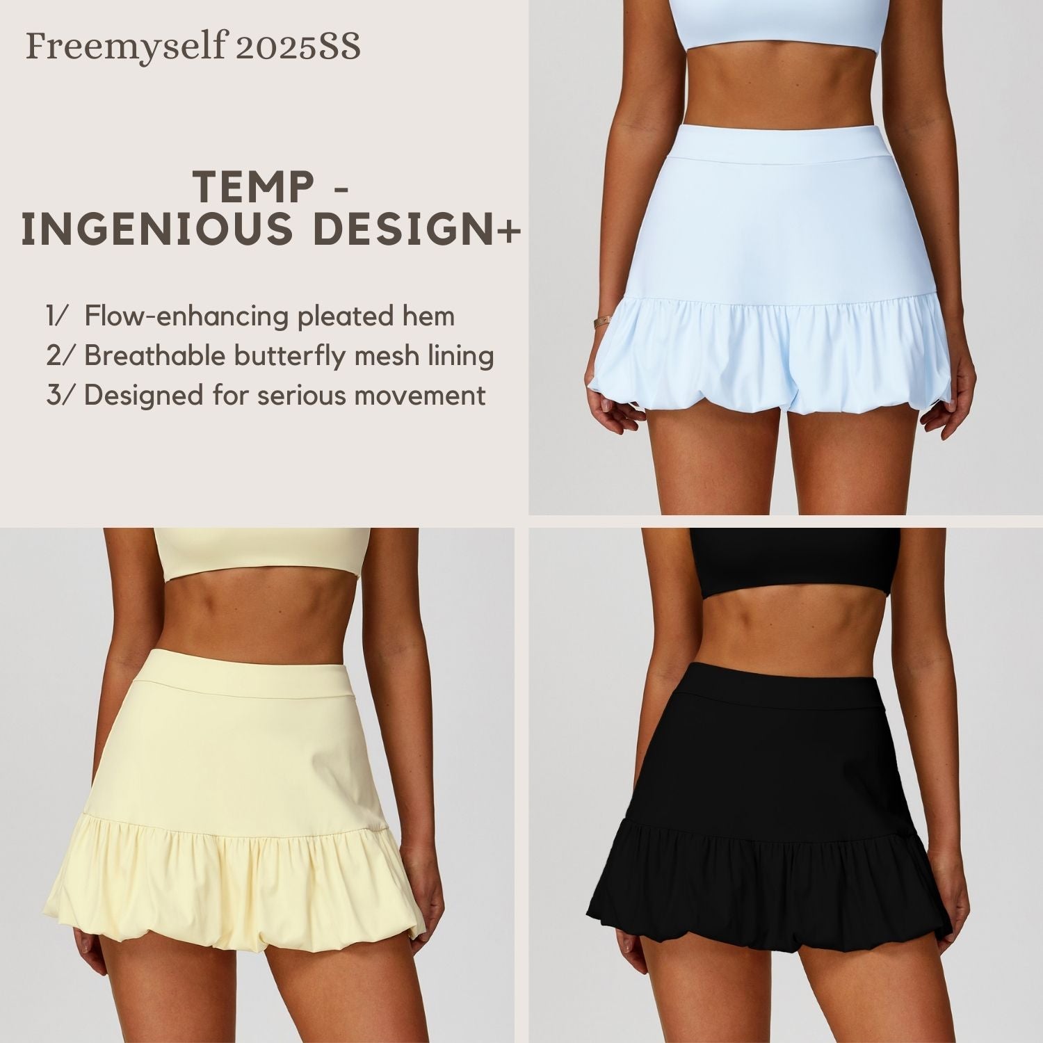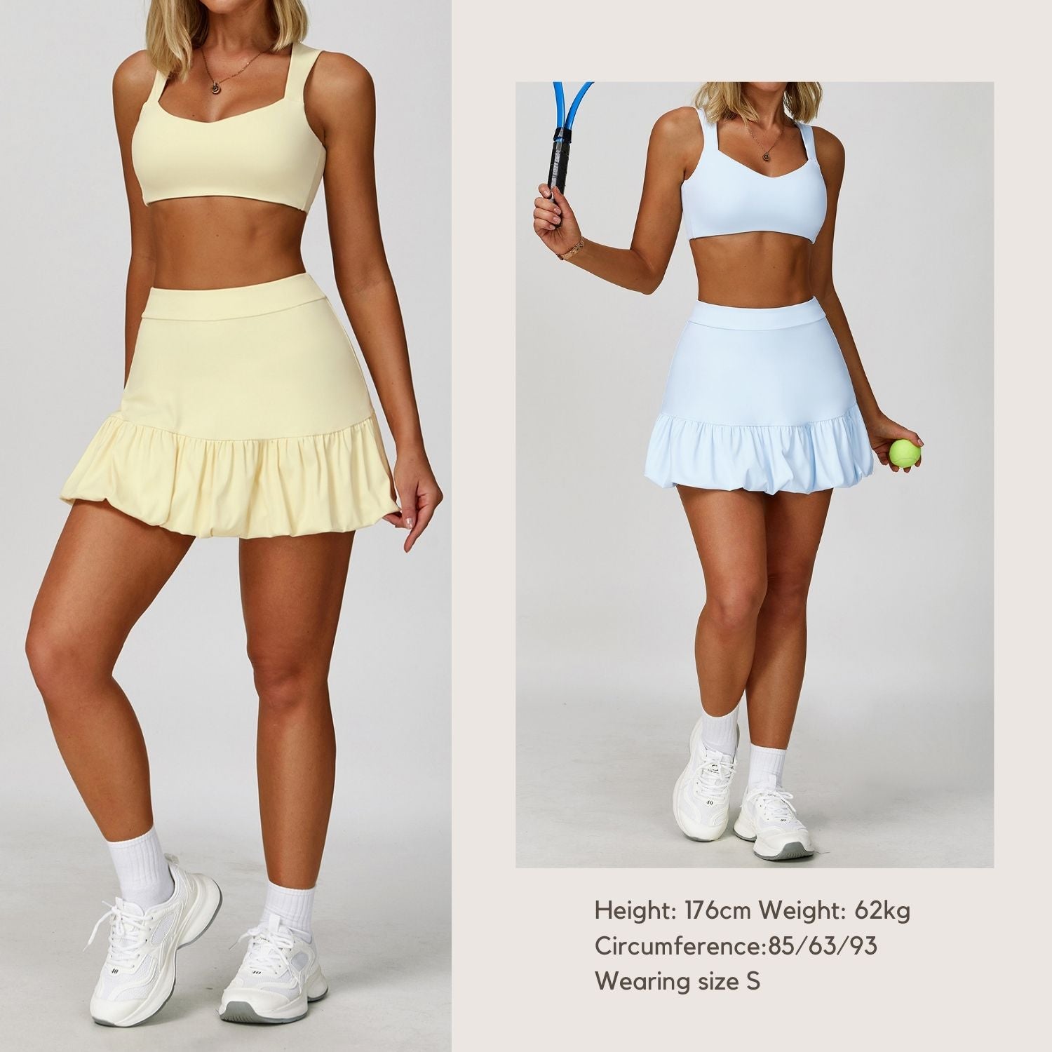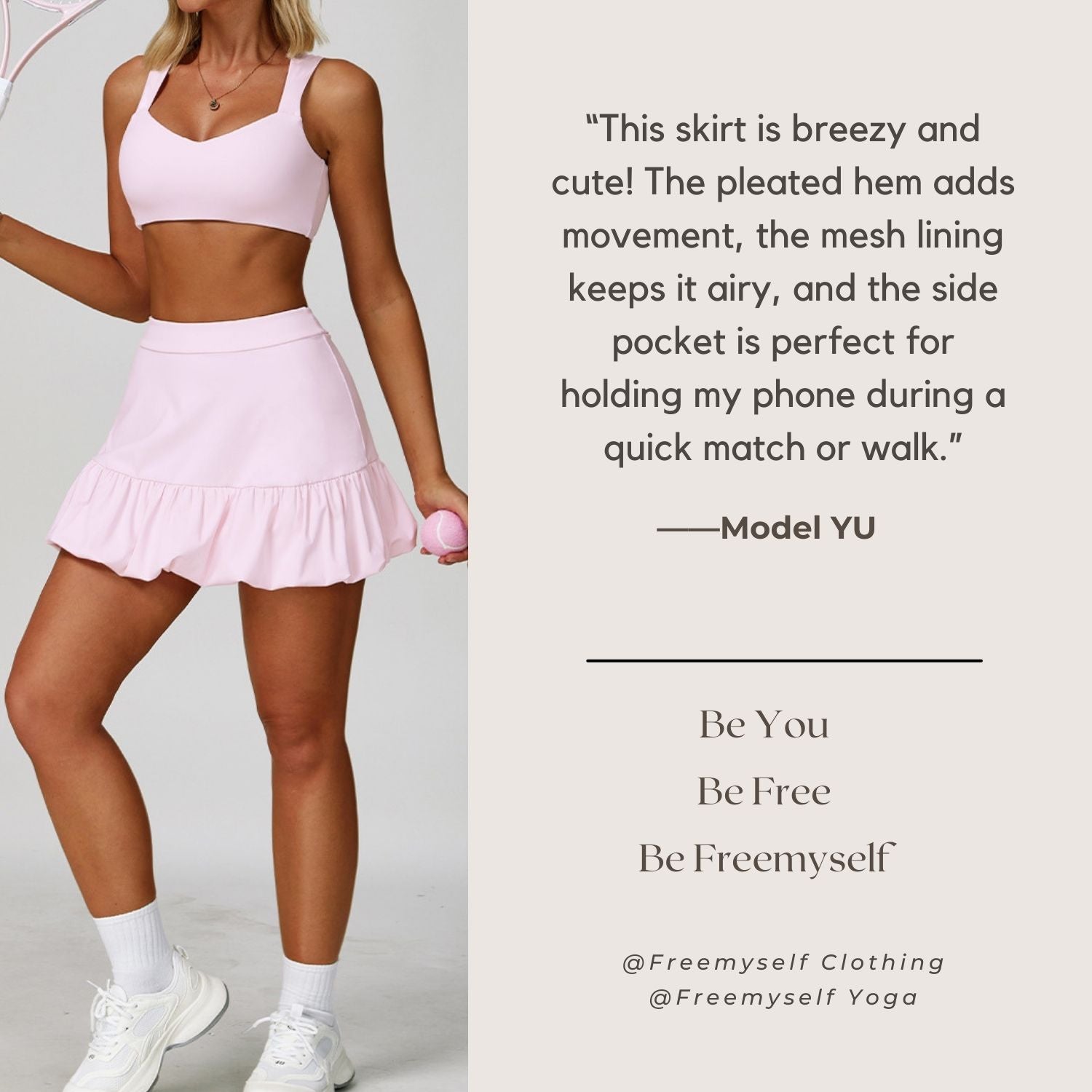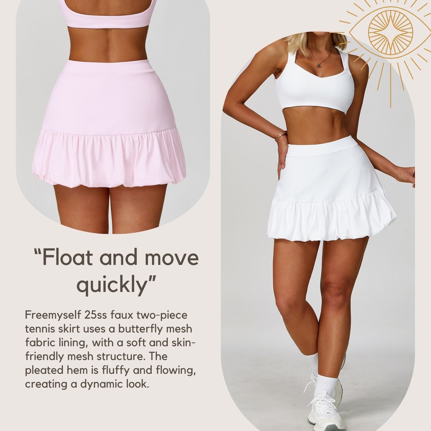 Freemyself 25ss faux two-piece tennis skirt uses a butterfly mesh fabric lining, with a soft and skin-friendly mesh structure. The pleated hem is fluffy and flowing, creating a dynamic look.