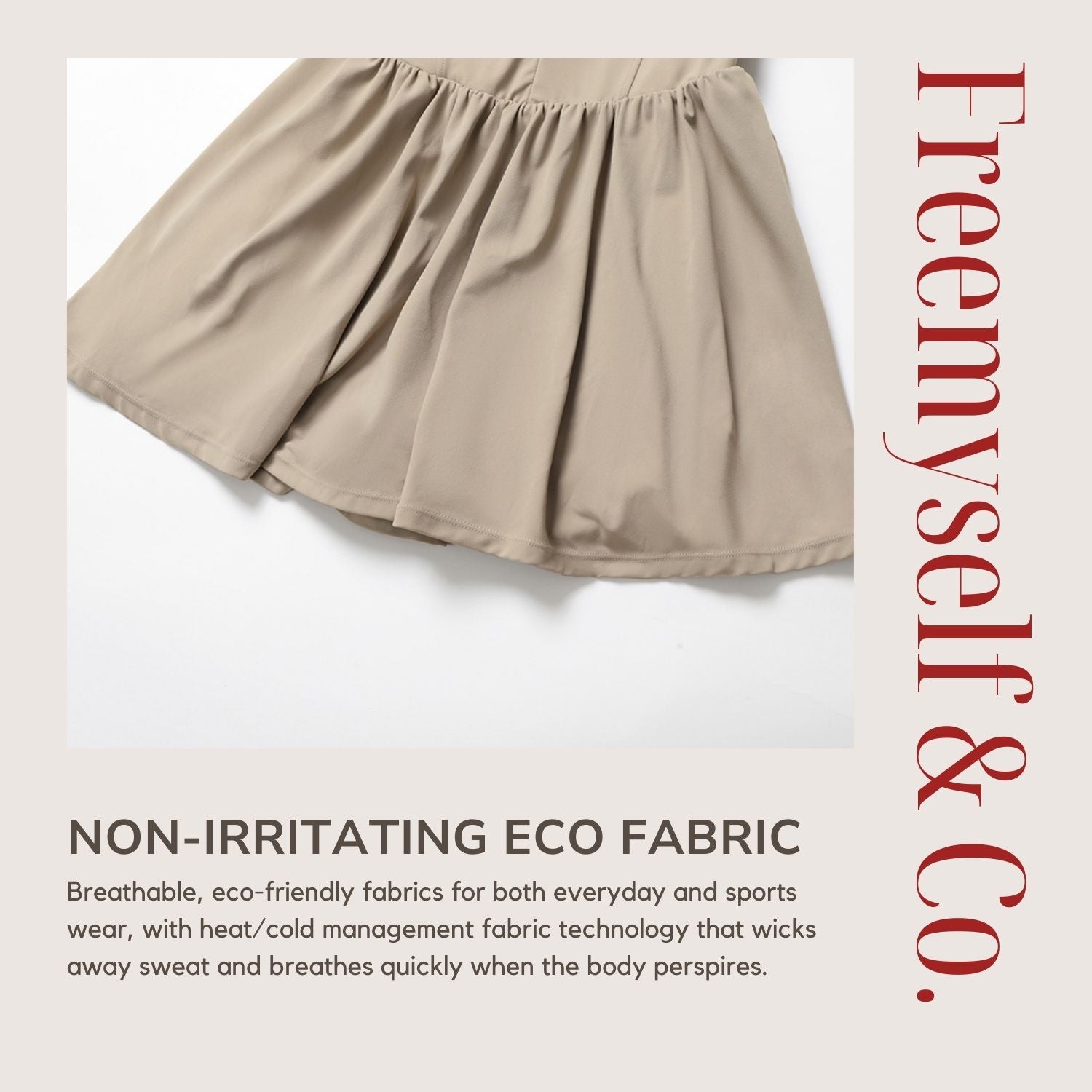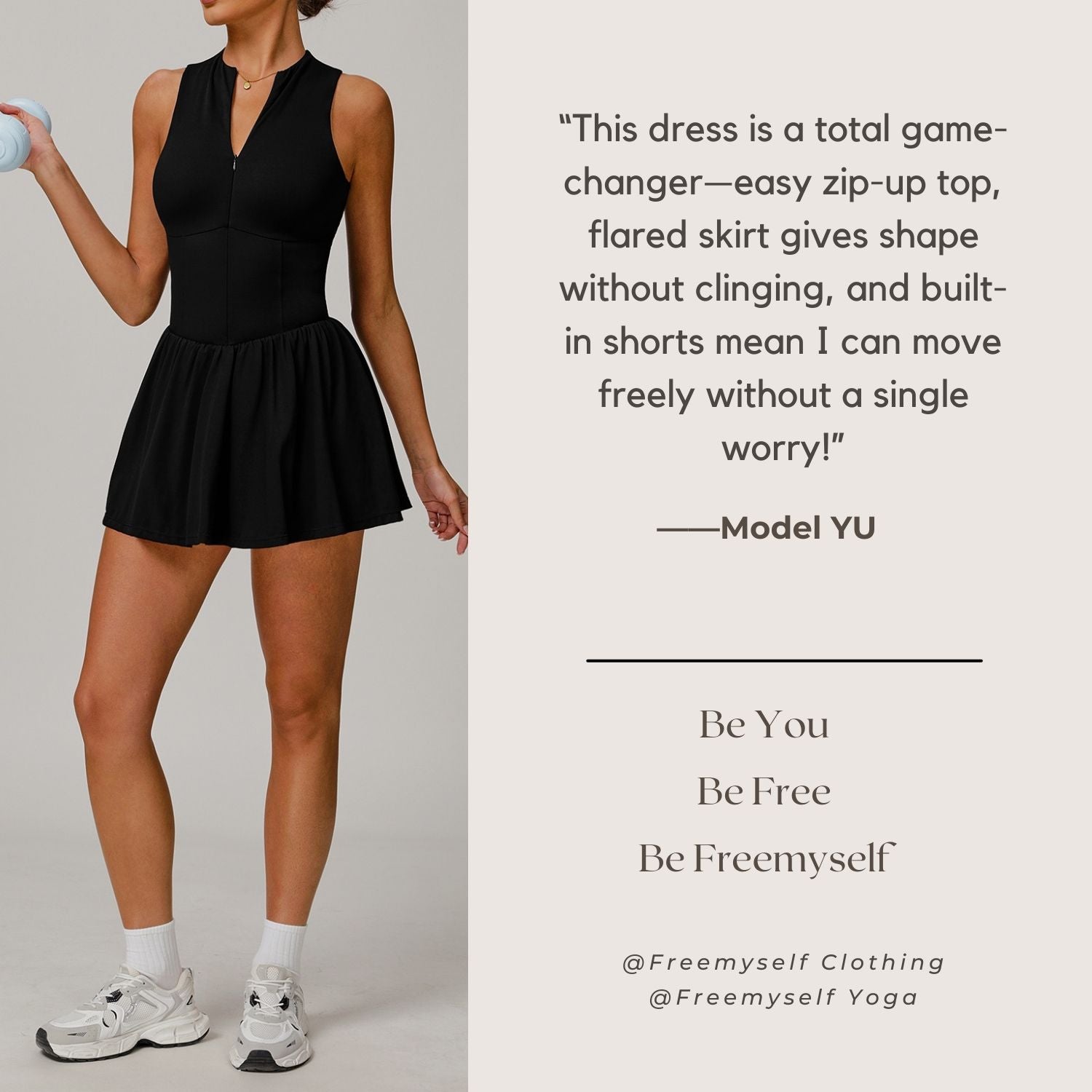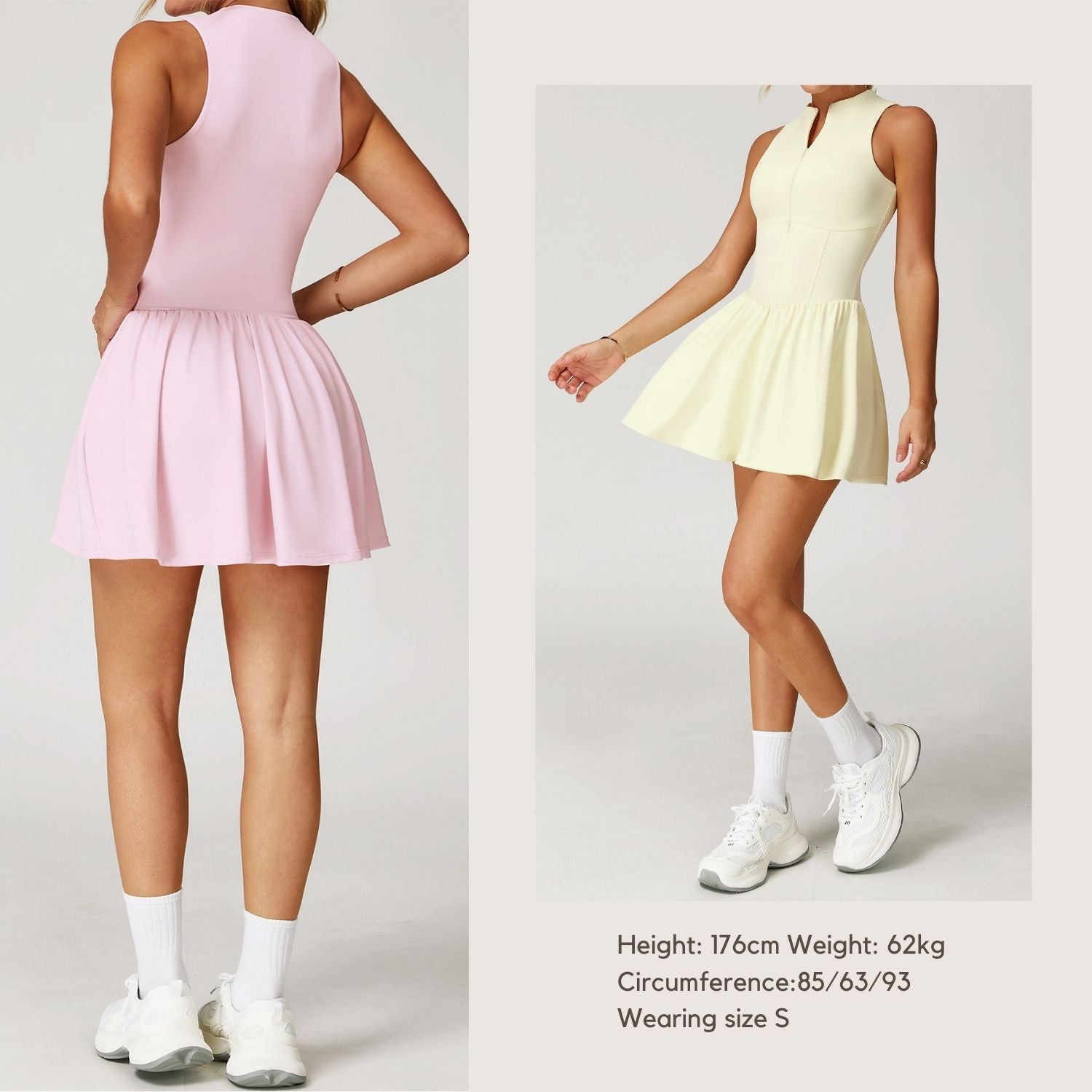 Freemyself 25ss faux two-piece stand-up collar dress features a stand-up collar half-zip design for easy wear and adjustable fit. It comes with built-in anti-exposure leggings that are form-fitting without being tight, allowing for a wide range of movement.