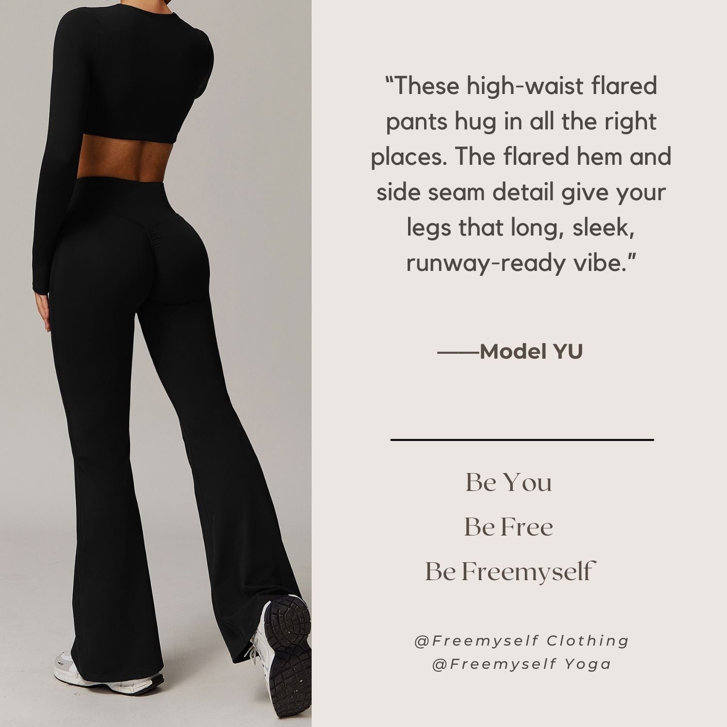 Freemyself 25ss skinny flared pants feature a high-waisted design that flattens the stomach, shapes the waist, and slims the figure without constricting the skin. The flared hemline conceals the calves and elongates the leg line.